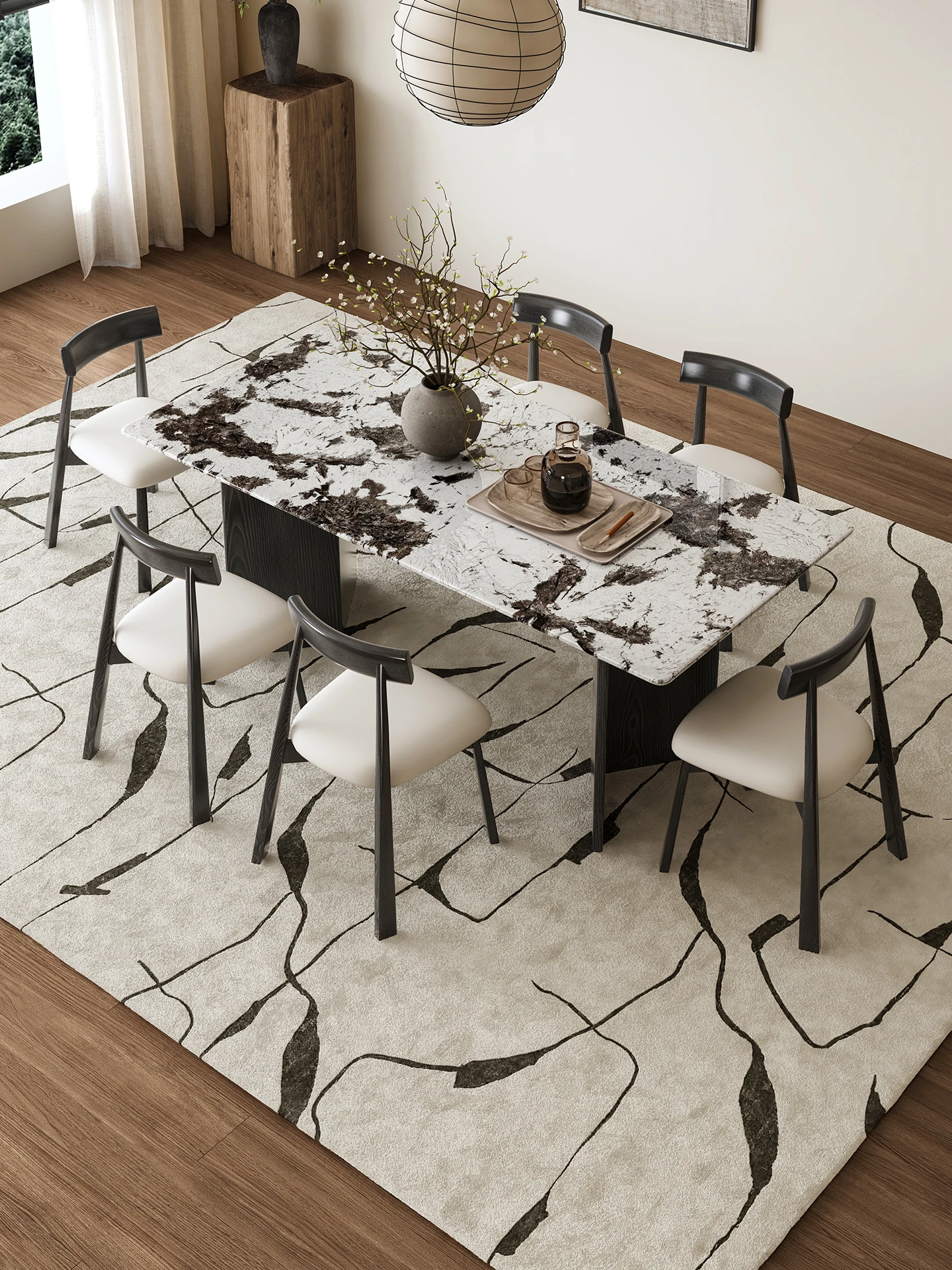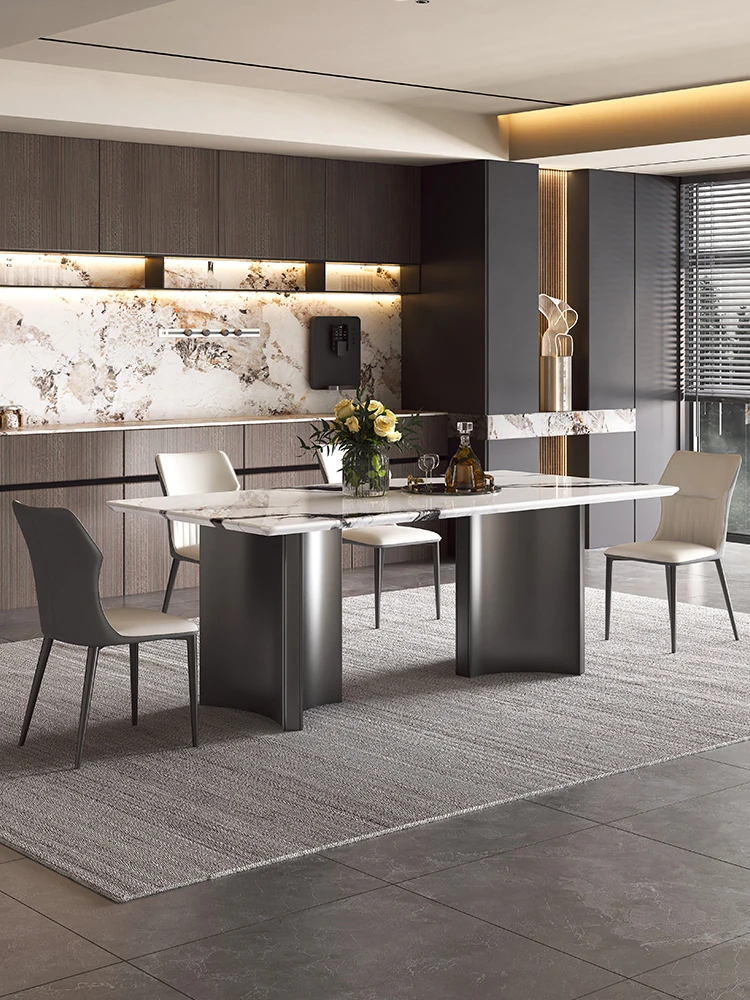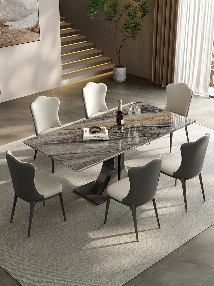 2025年新作!軽やかで高級感あふれるプラチナダイヤモンドストーンのイタリアンシンプル長方形ダイニングテーブル&チェアセット。洗練されたデザインで、あなたの食卓を特別な空間に演出します!