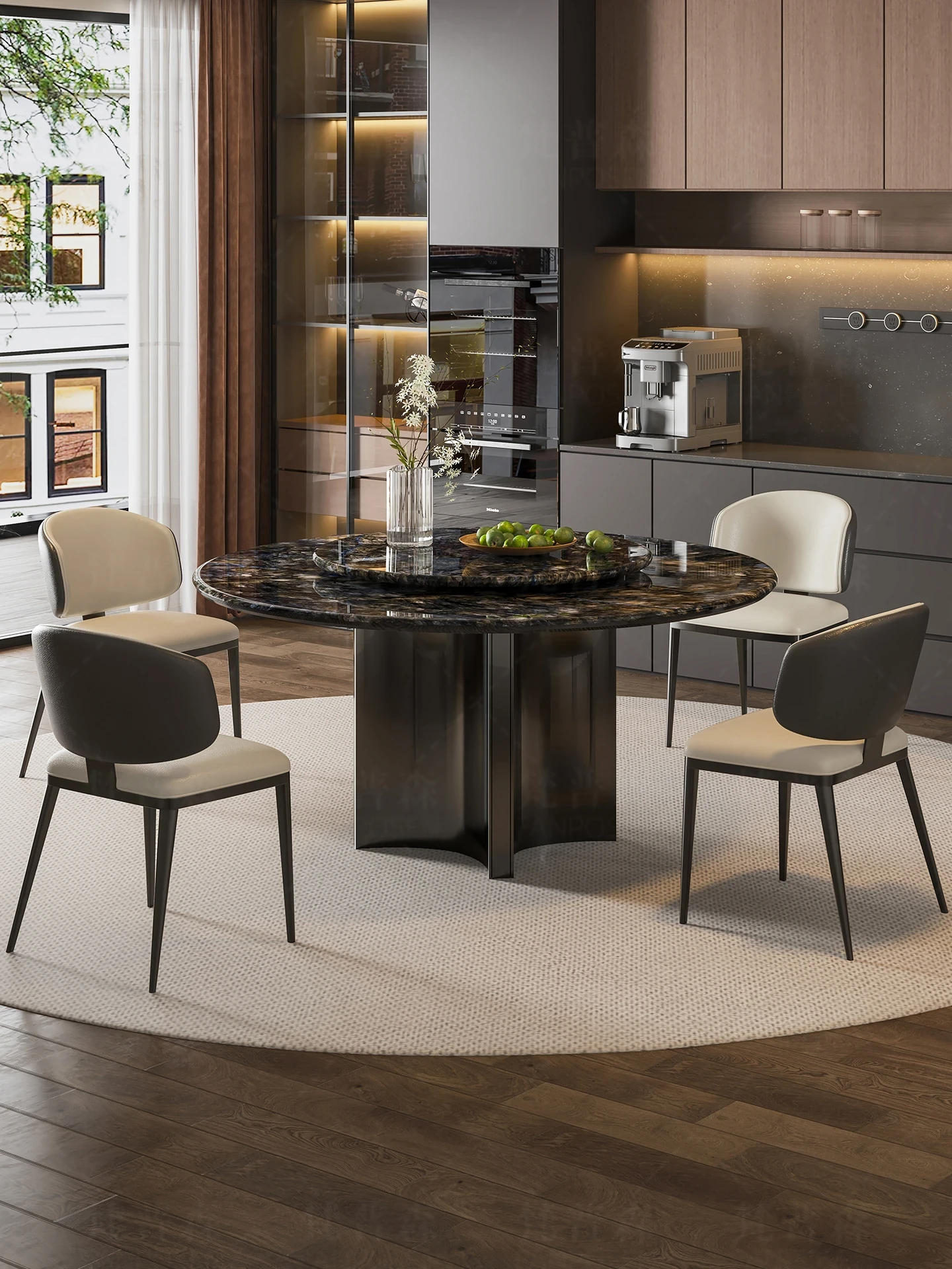 高級感あふれるヴェネツィアブラウン大理石円形ダイニングテーブルセット - イタリアンスタイルの新作、回転式プレート付きで、食事をもっと楽しく!