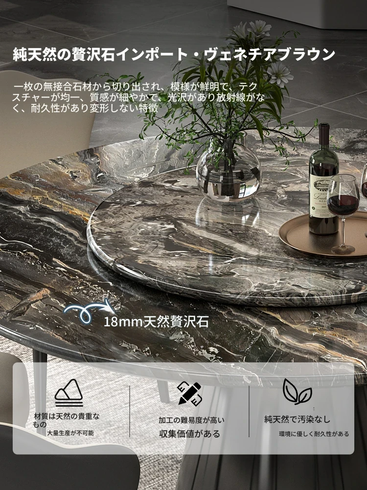 2025年新作!高級感あふれる天然大理石の実木ダイニングテーブル。クラシックな雰囲気とモダンなデザインが融合したラウンドテーブル。回転盤付きで、食事がもっと楽しくなる!