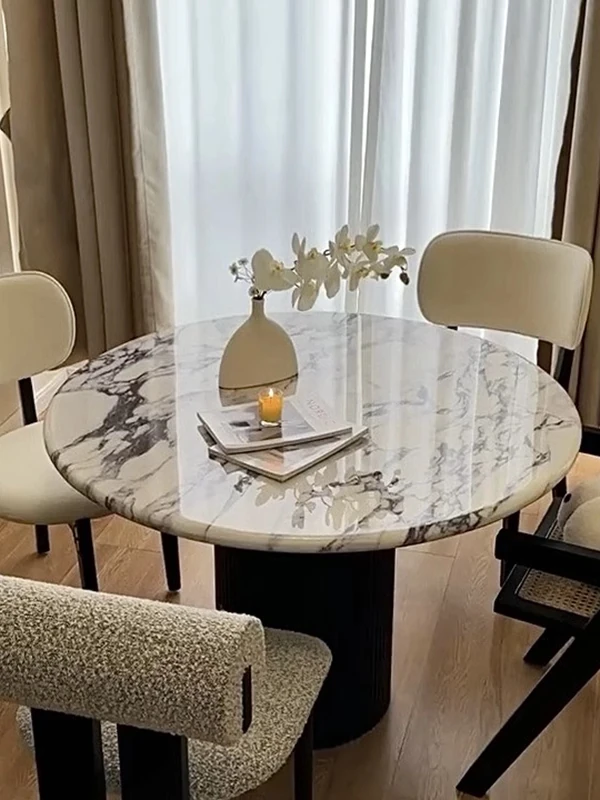 宝格丽のモダンでシンプルなカジュアルダイニングテーブル - 高級感あふれる円形の大理石デザイン、クリームカラーのフレンチヴィンテージスタイルで、小さなお部屋にもぴったり!