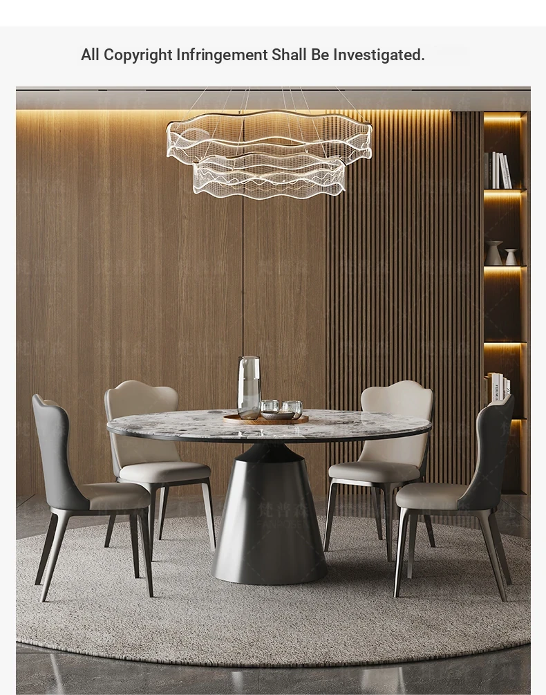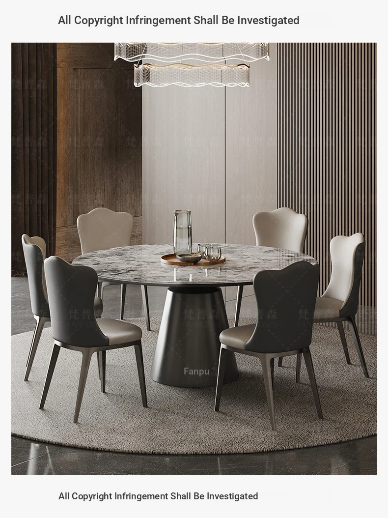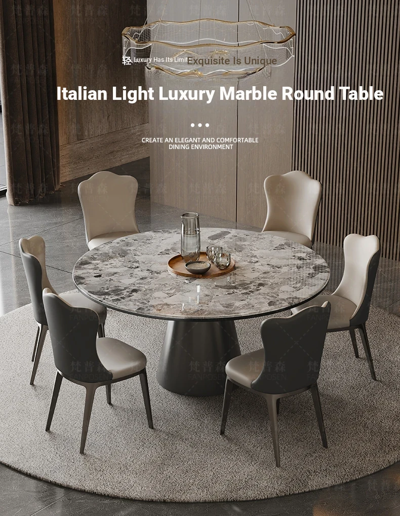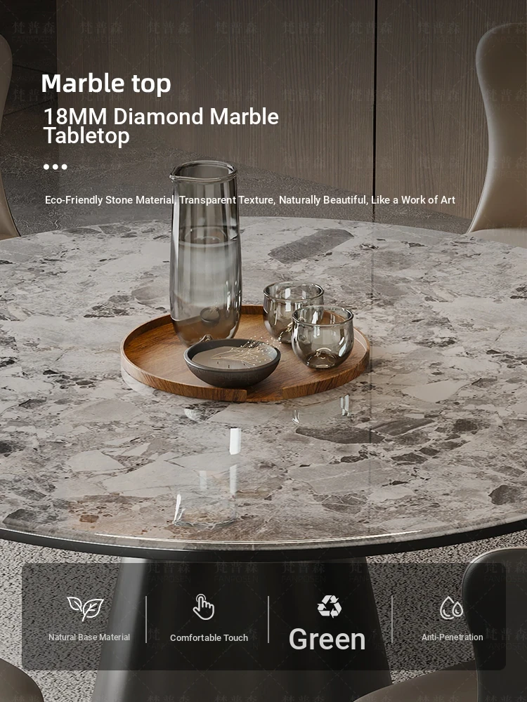 Oreo gray marble round dining table + turntable + Super Cat scratch leather dining chair * 6