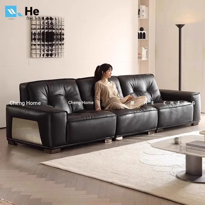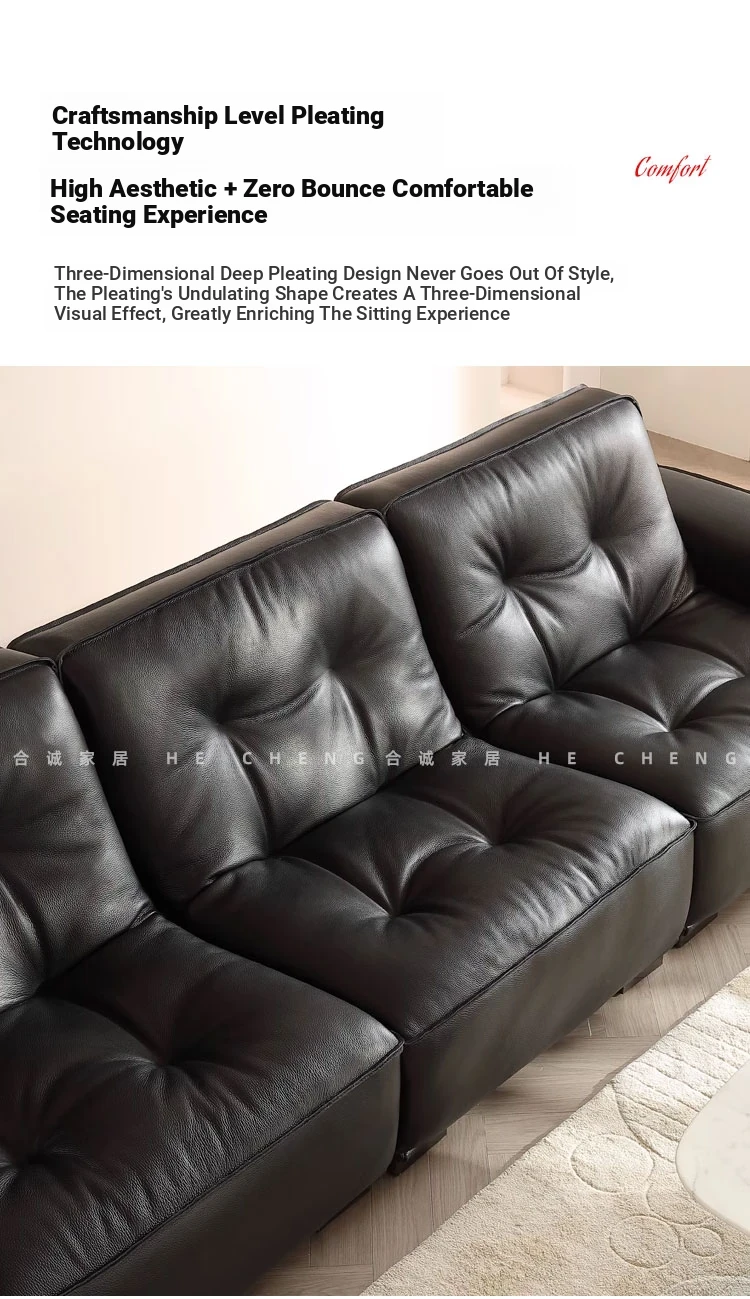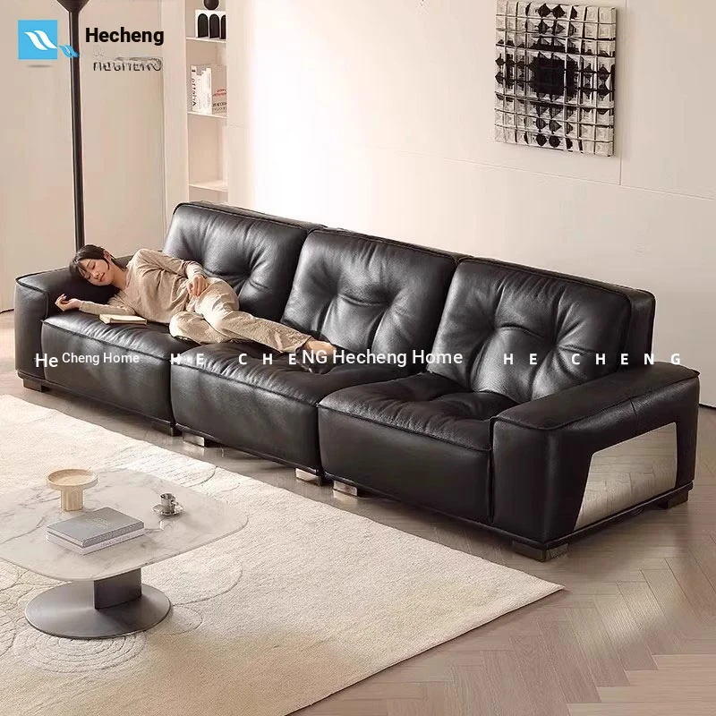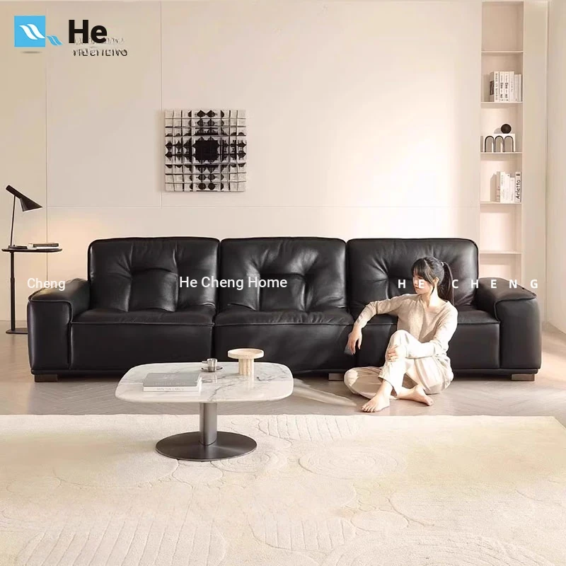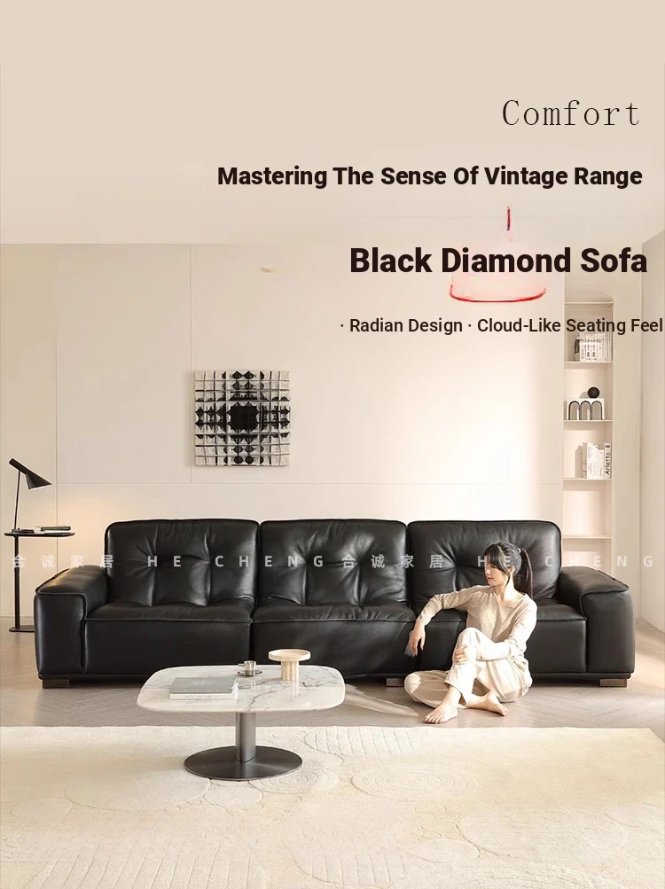 Heceng Home Genuine Leather Sofa - Top Grain Black Diamond Italian Minimalist Design, Perfect for Small Living Rooms with a Touch of Luxury