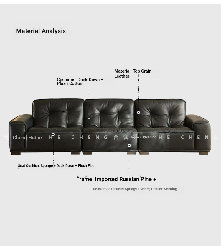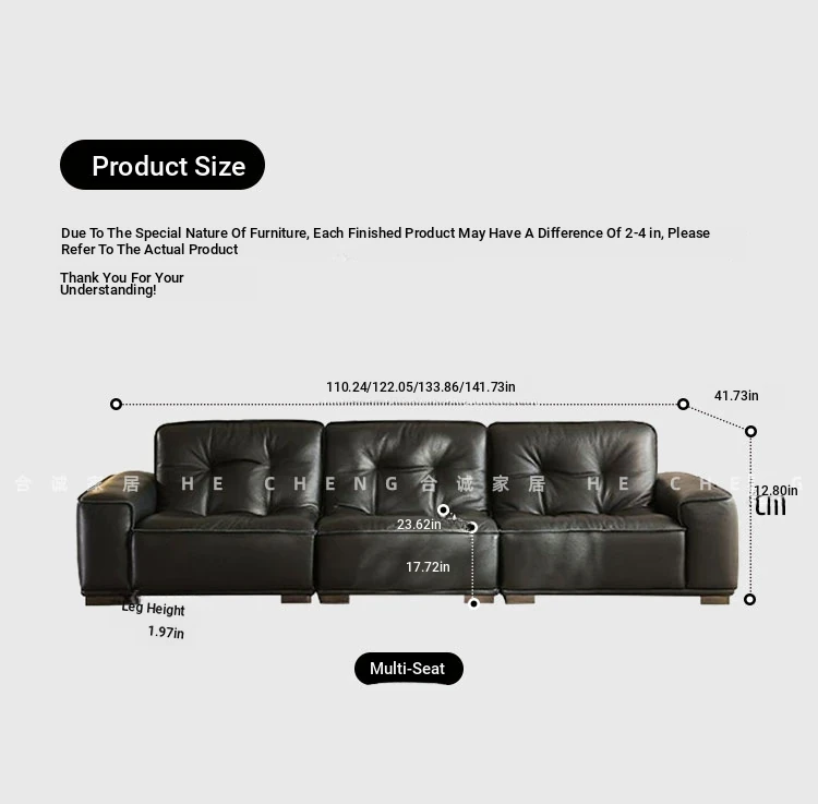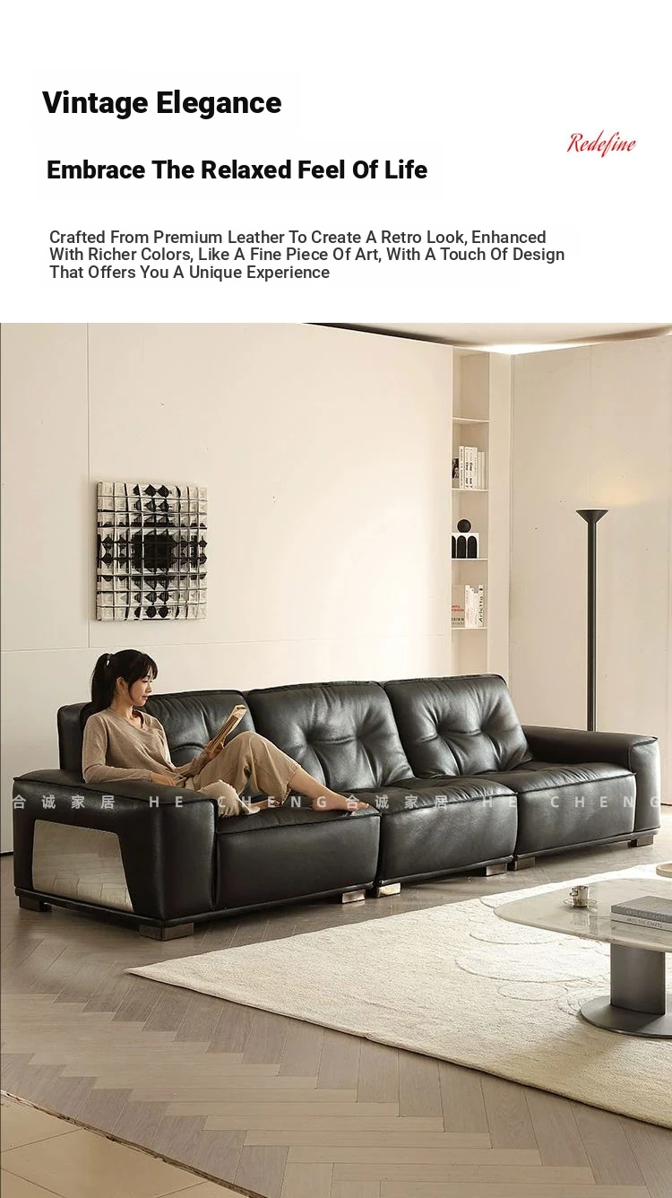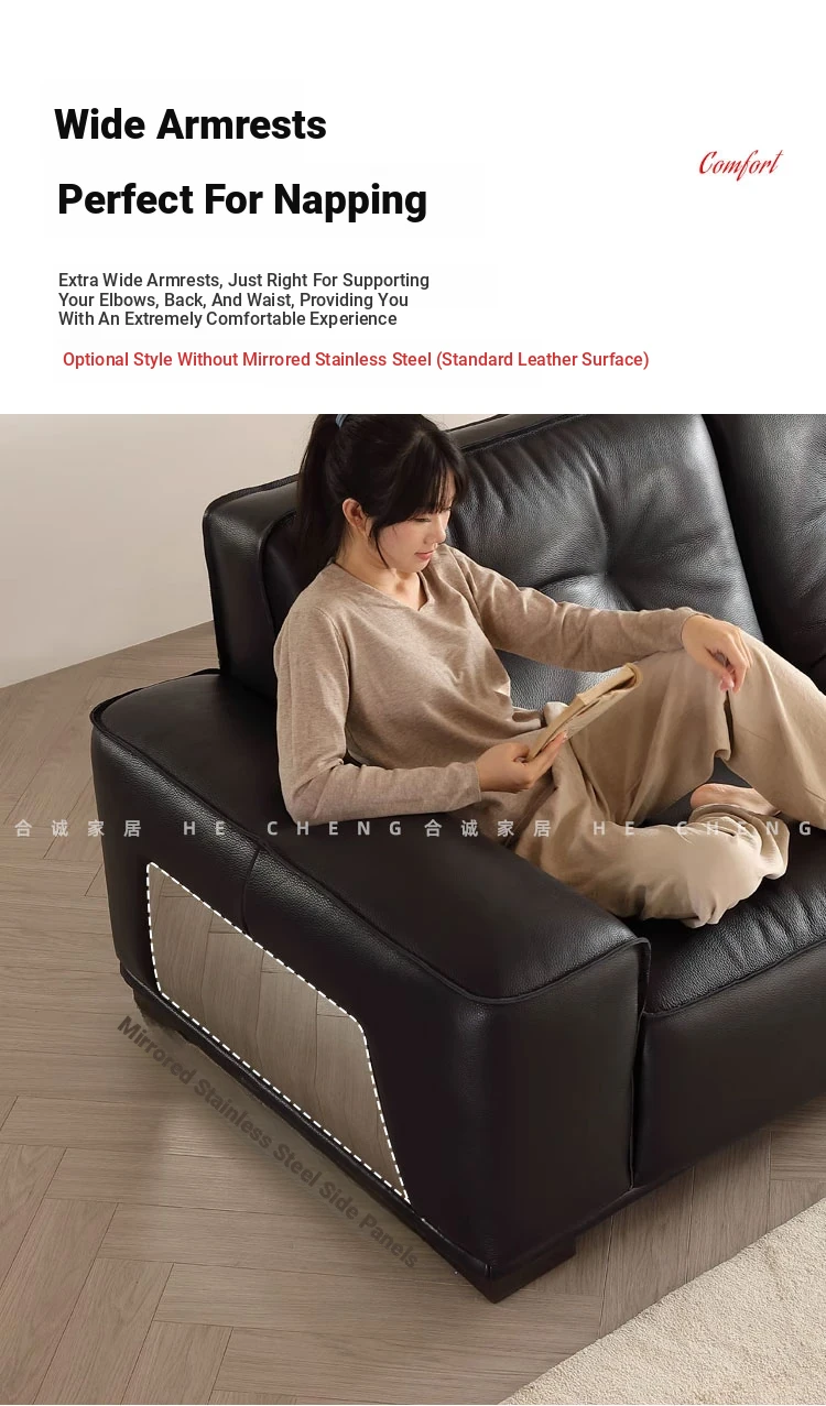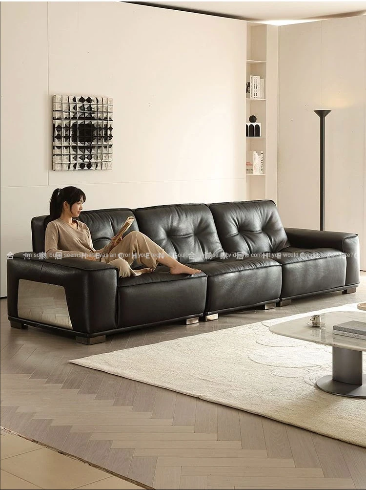 Heceng Home Genuine Leather Sofa - Top Grain Black Diamond Italian Minimalist Design, Perfect for Small Living Rooms with a Touch of Luxury