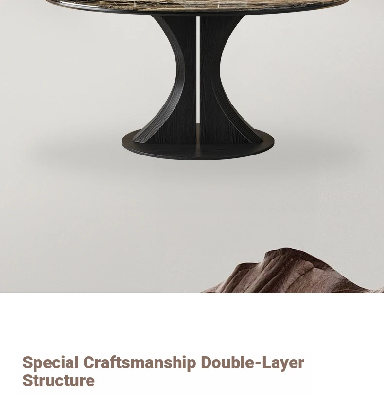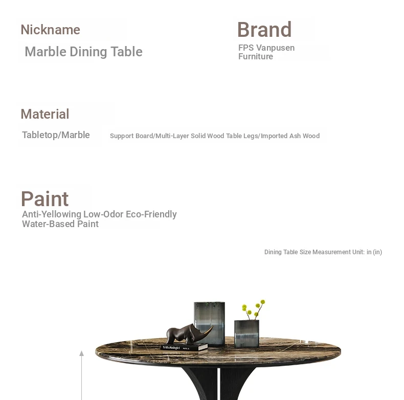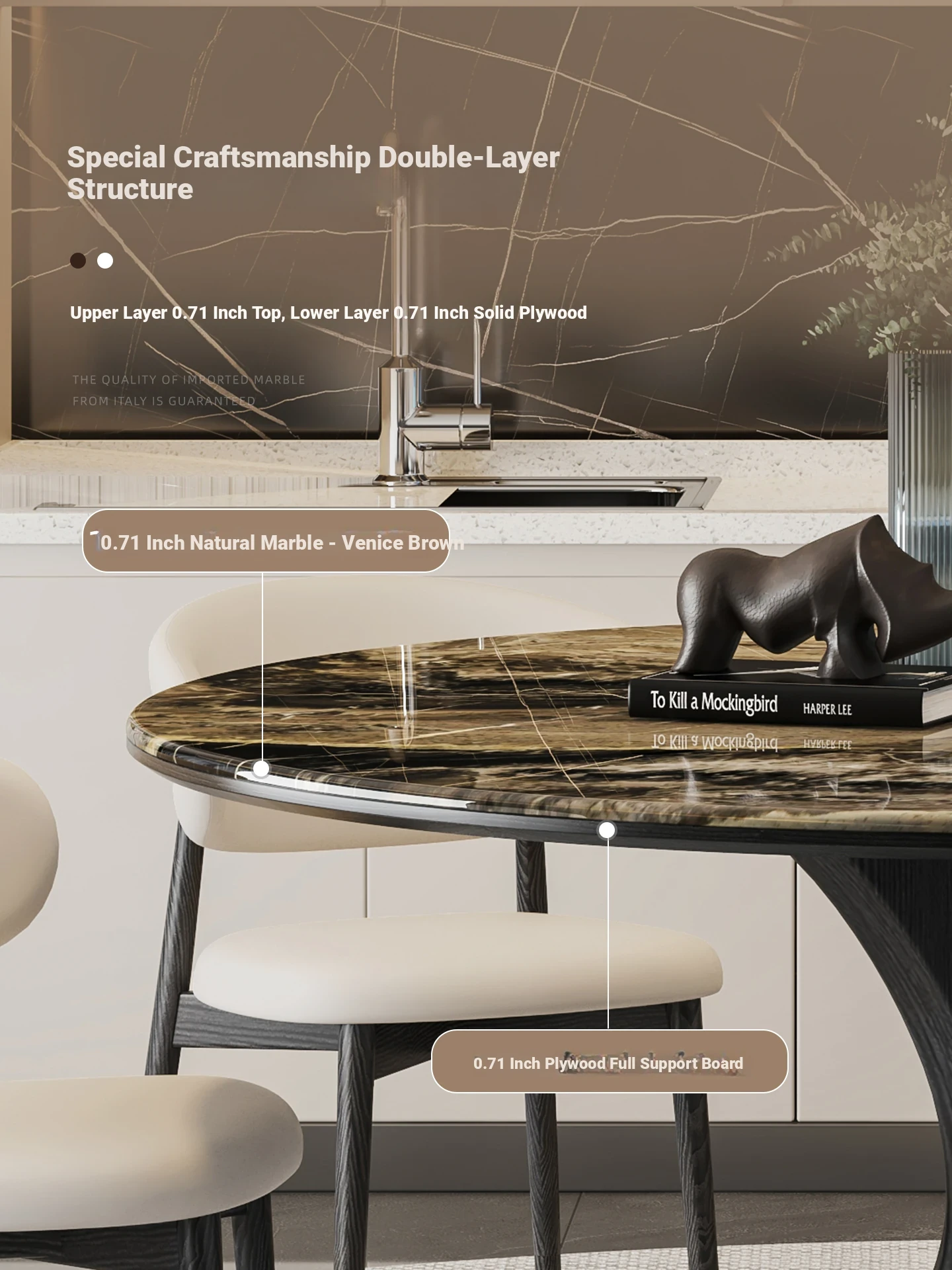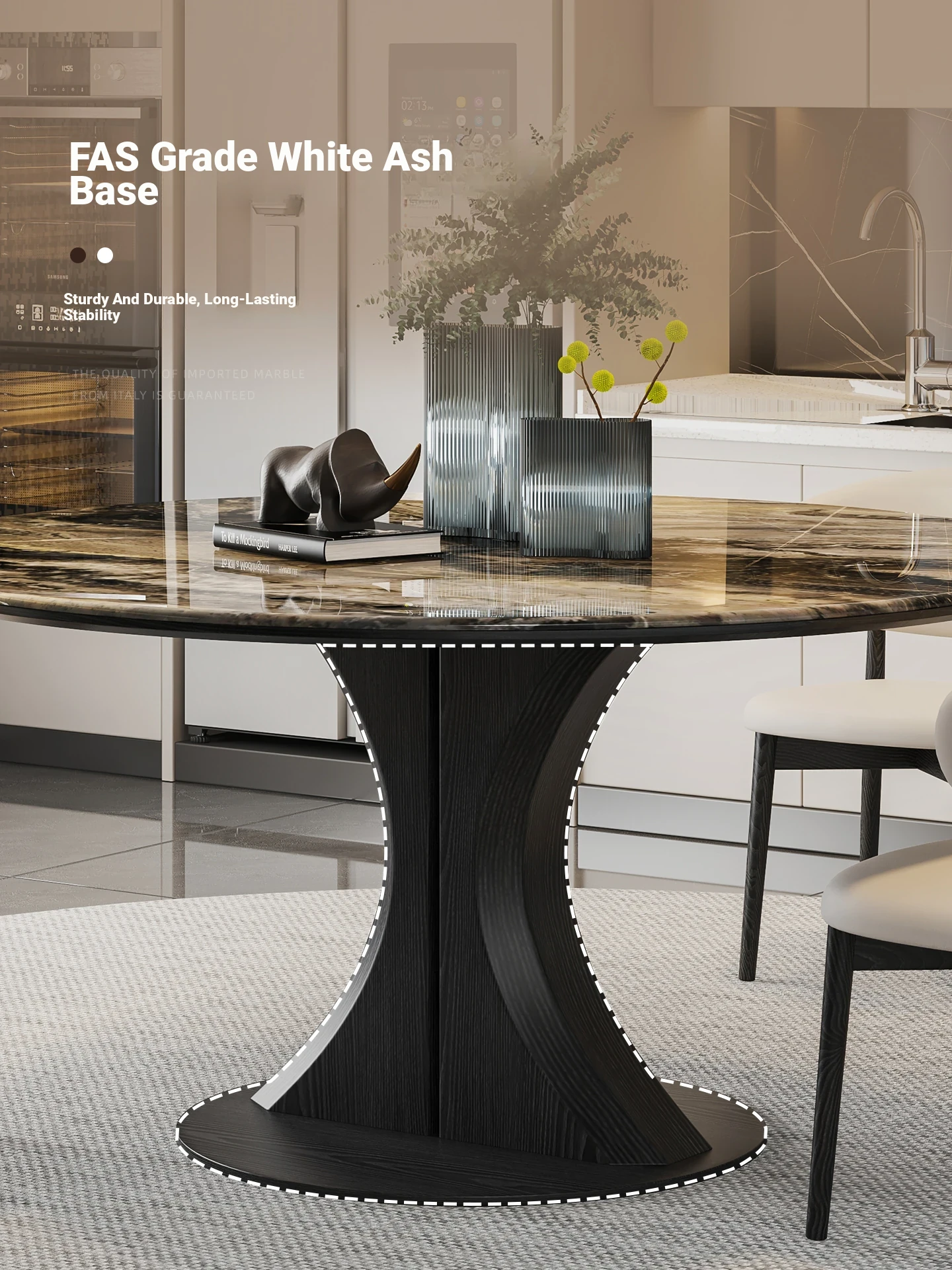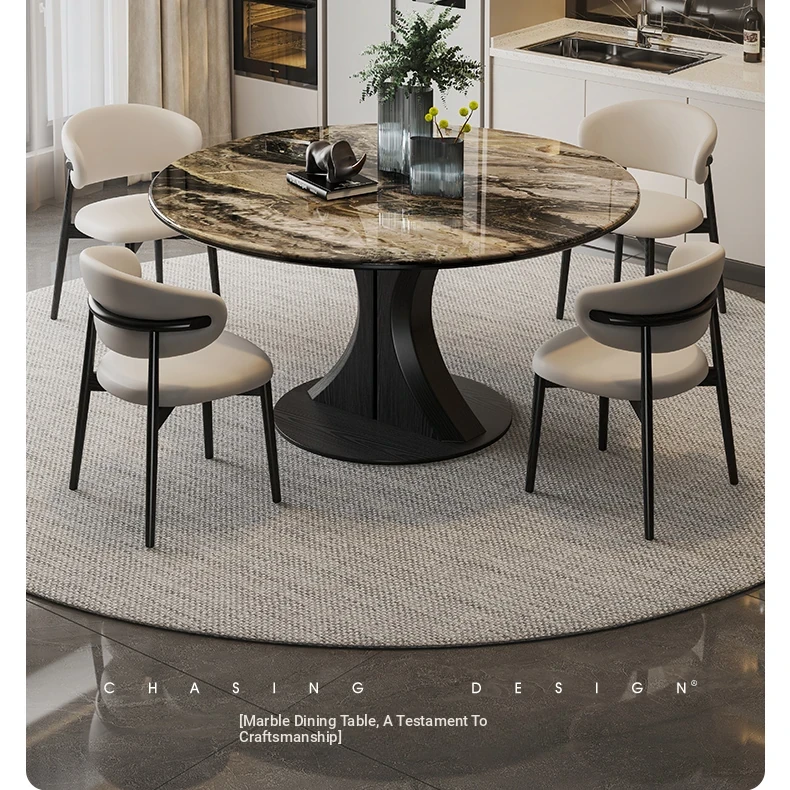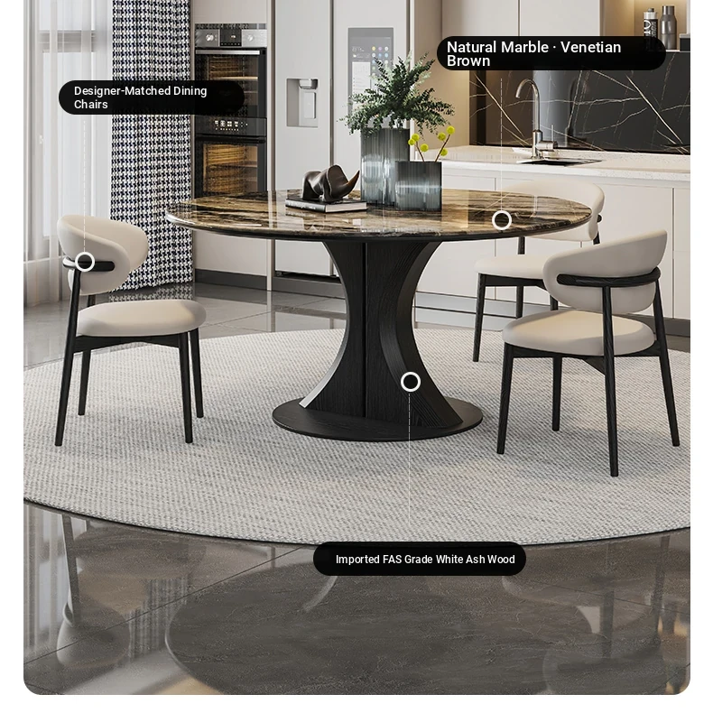 High-End Vintage Style Round Dining Table with Marble Veneer and Solid Wood Base – Elegant Circular Table for Home Living Room, Featuring a Convenient Rotating Turntable