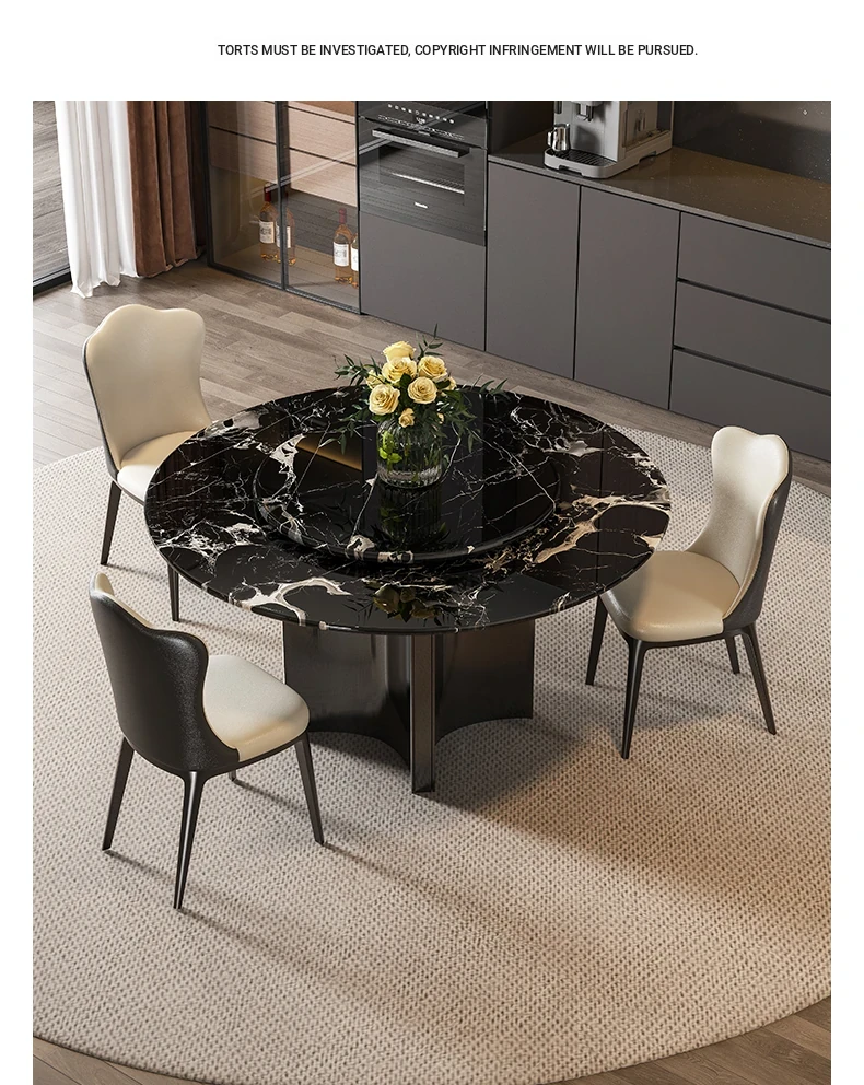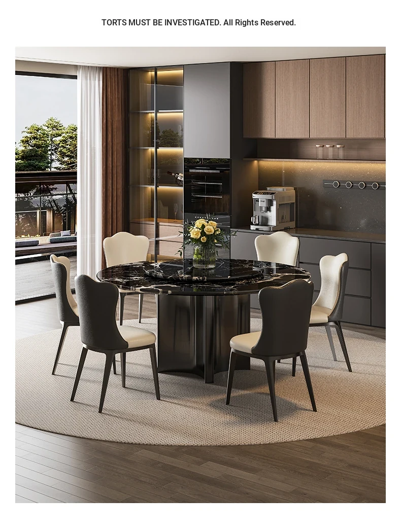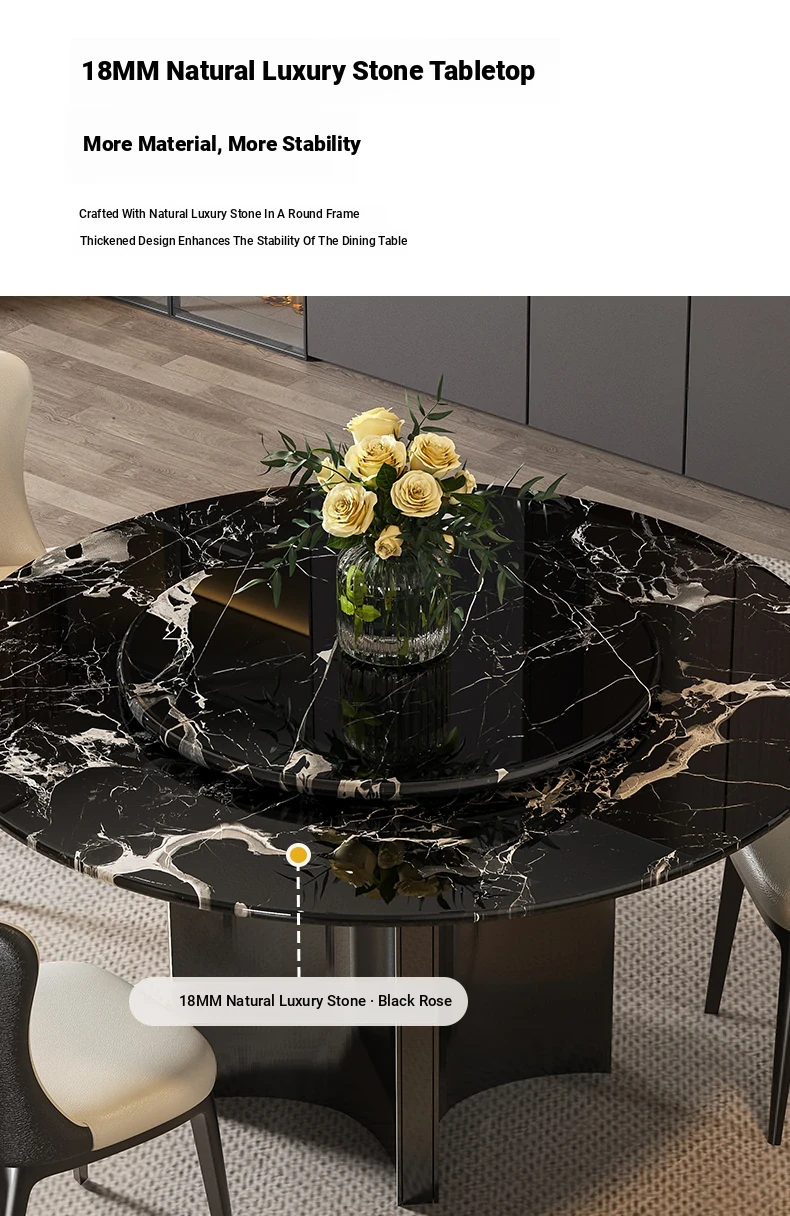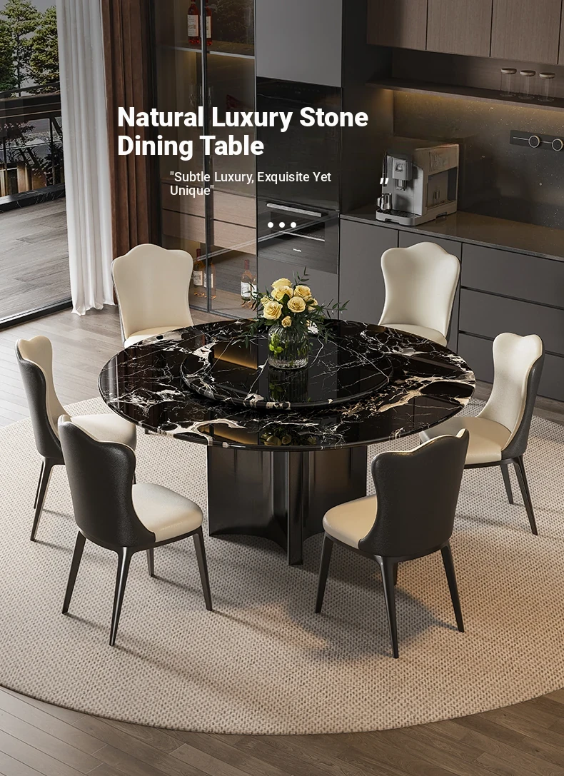 Imported Black Rose Natural Luxury Stone Round Table + Turntable + Leather Chair*6