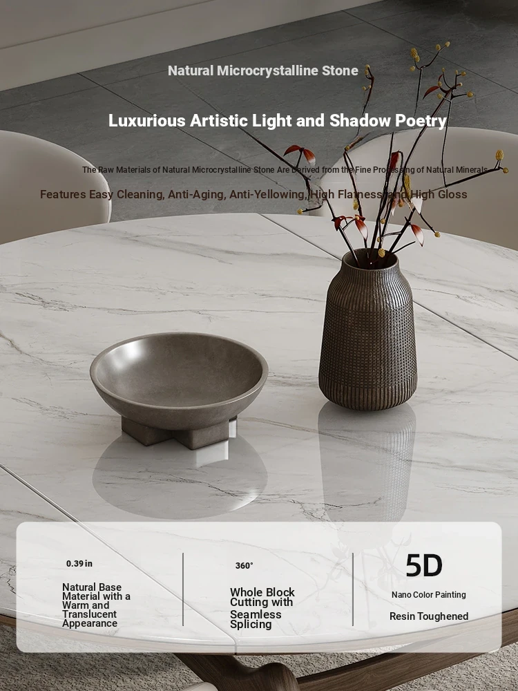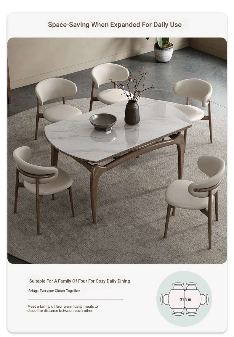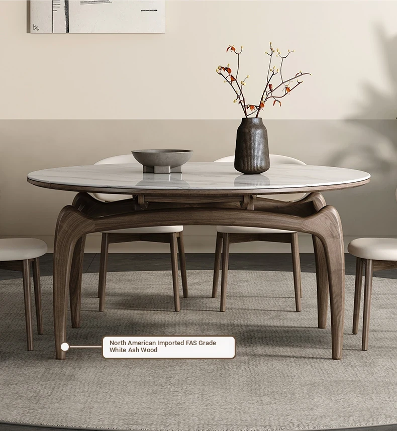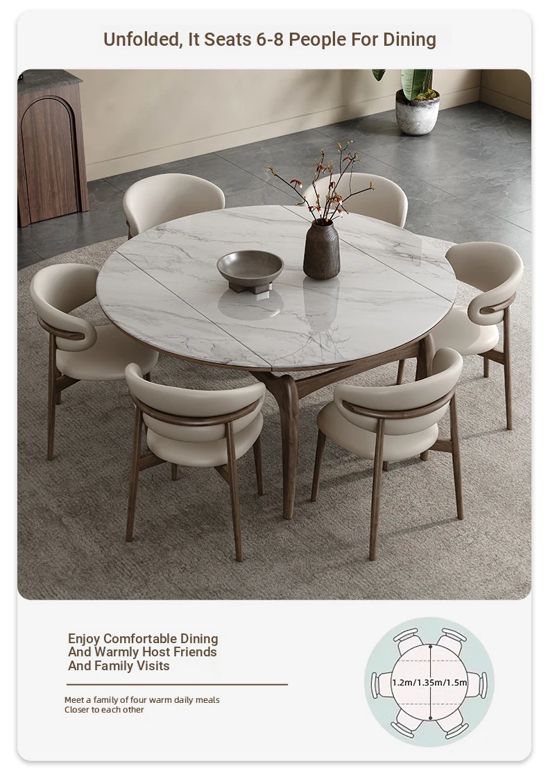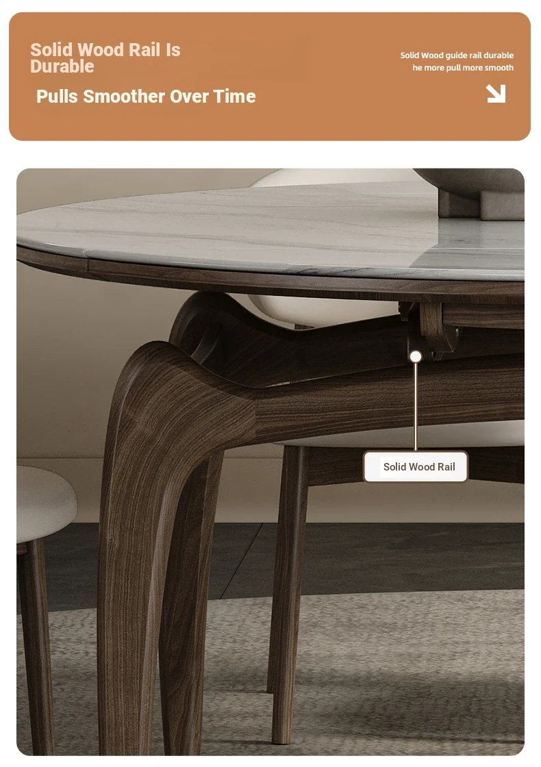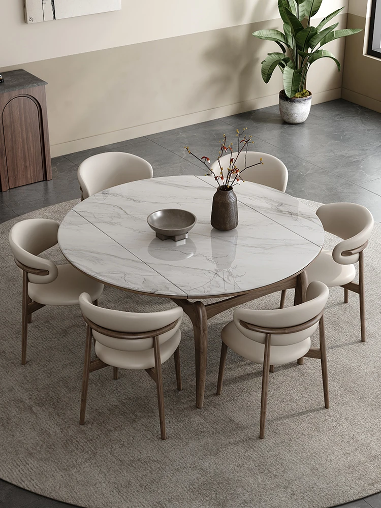 Natural Marble Expandable Solid Wood Dining Table - New Vintage Style Round Table with Light Luxury Microcrystalline Stone Dining Chair Set