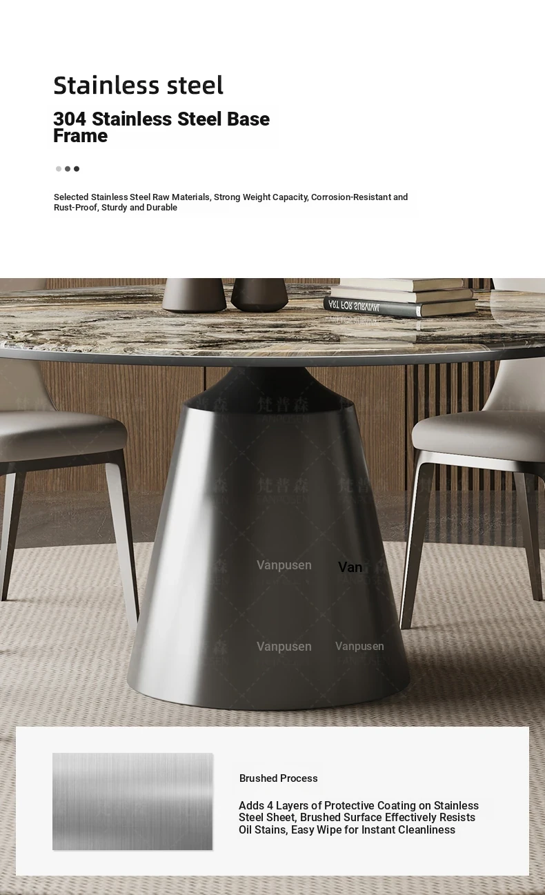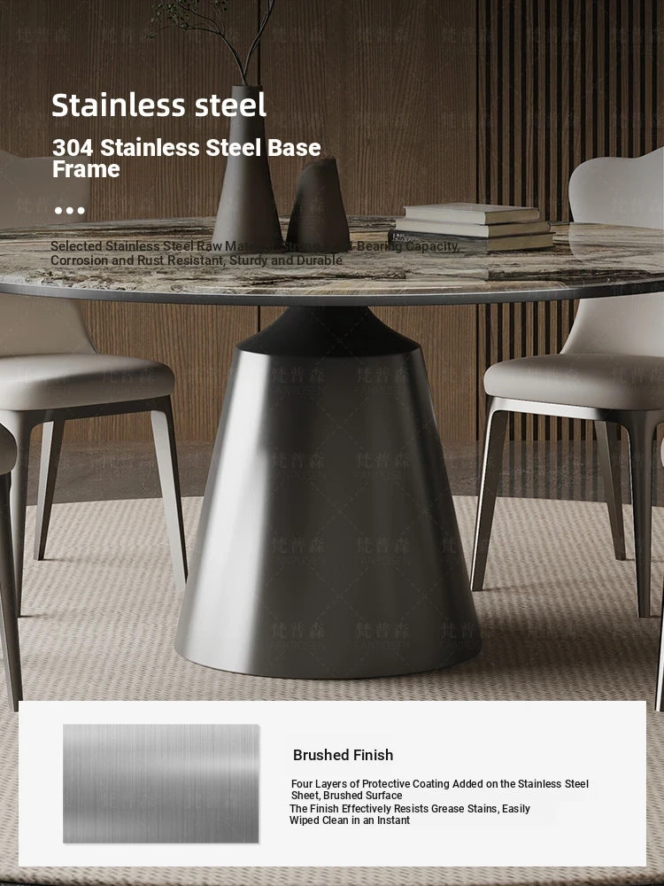 Venice brown marble round table + turntable + Super Cat scratch leather dining chair * 4
