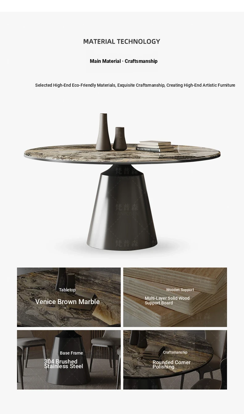 Venice brown marble round table + Super Cat scratch leather dining chair * 4