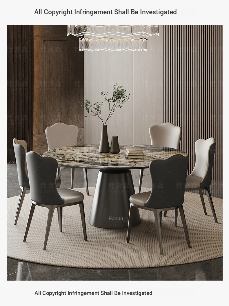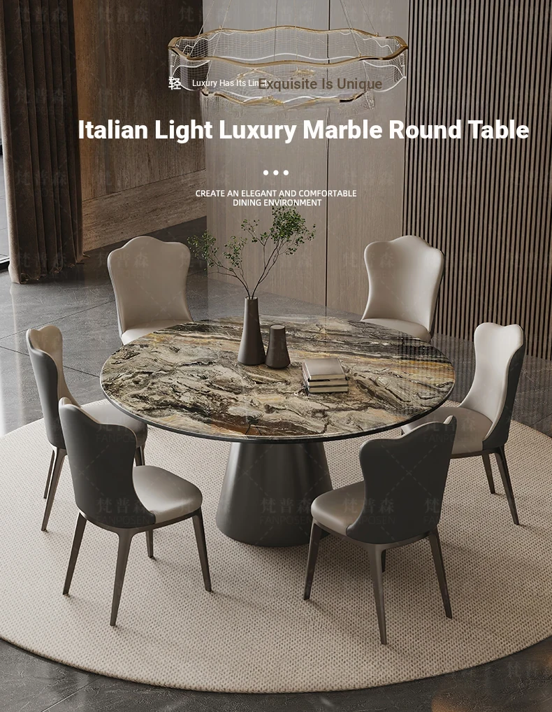 Venice brown marble round table + turntable + Super Cat scratch leather dining chair * 6