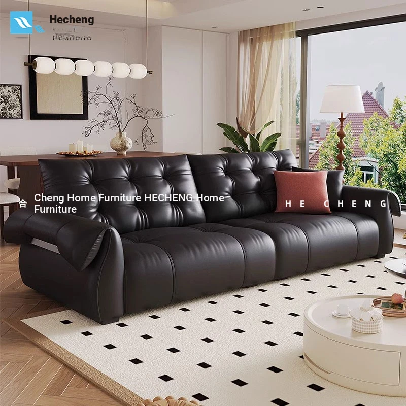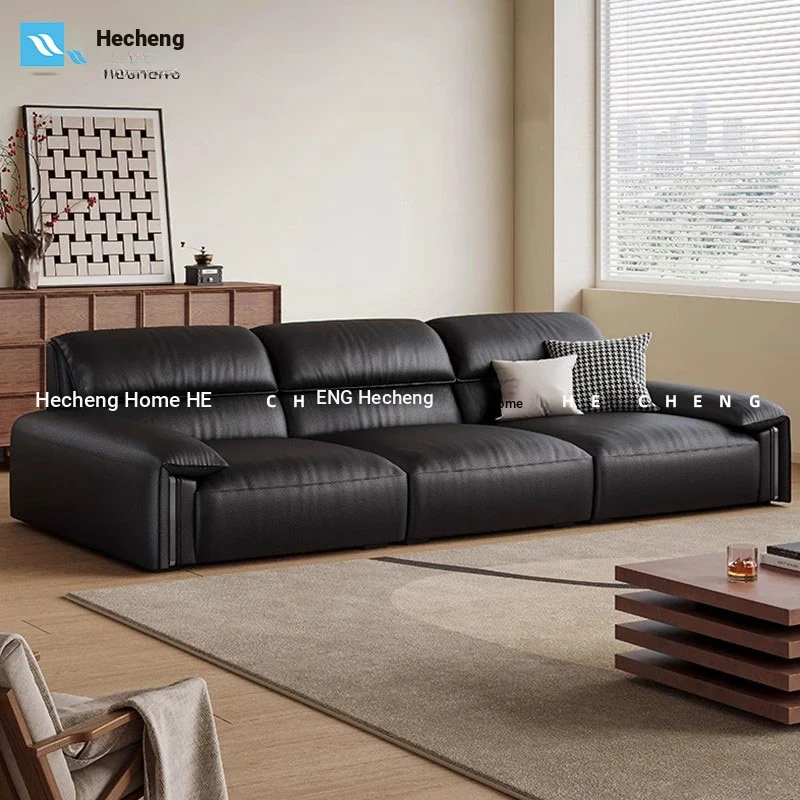 Hecang Genuine Leather Sofa - Italian Style Large Black Bear Design, Premium Cowhide for Small Living Rooms, Minimalist Straight-Line Black Sofa