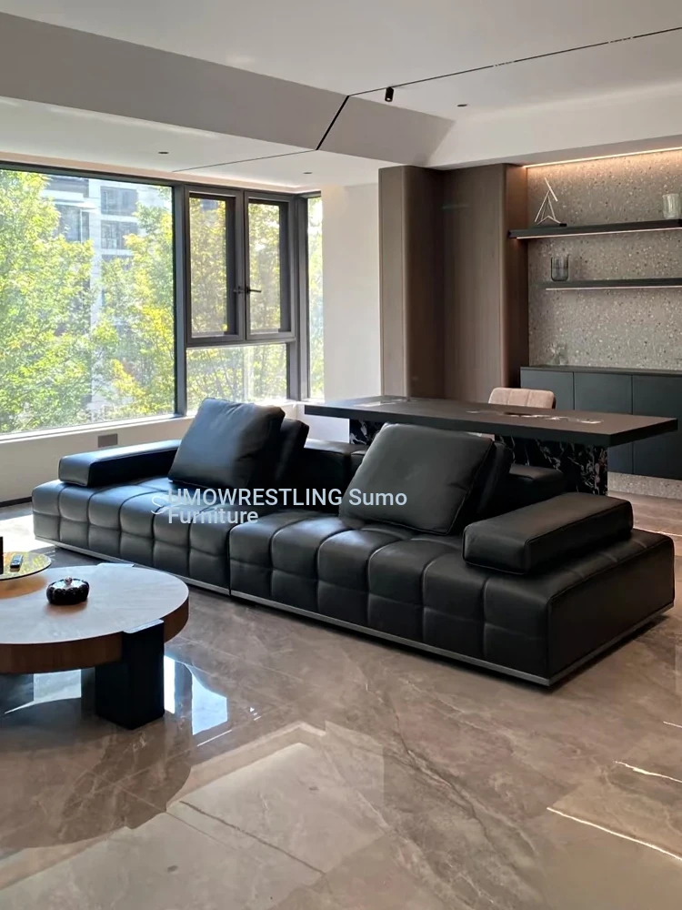 2025 New Arrival Large Black Cowhide Unique-Shaped Sofa - Modern Minimalist Black Tofu Block Design for Luxurious Living Room - Premium Leather Upholstery