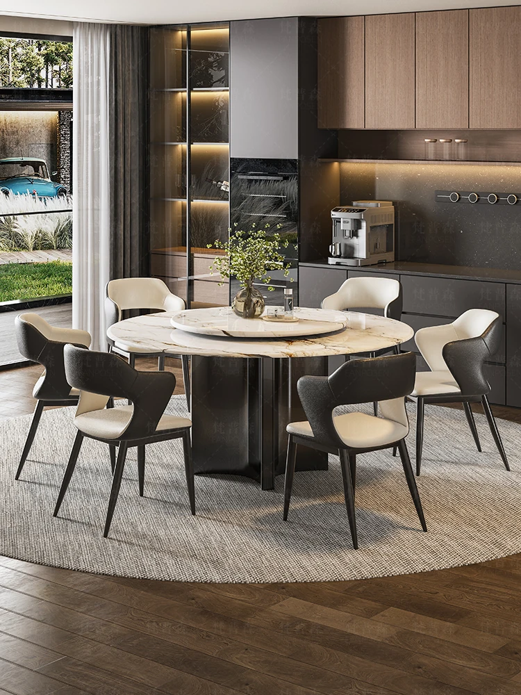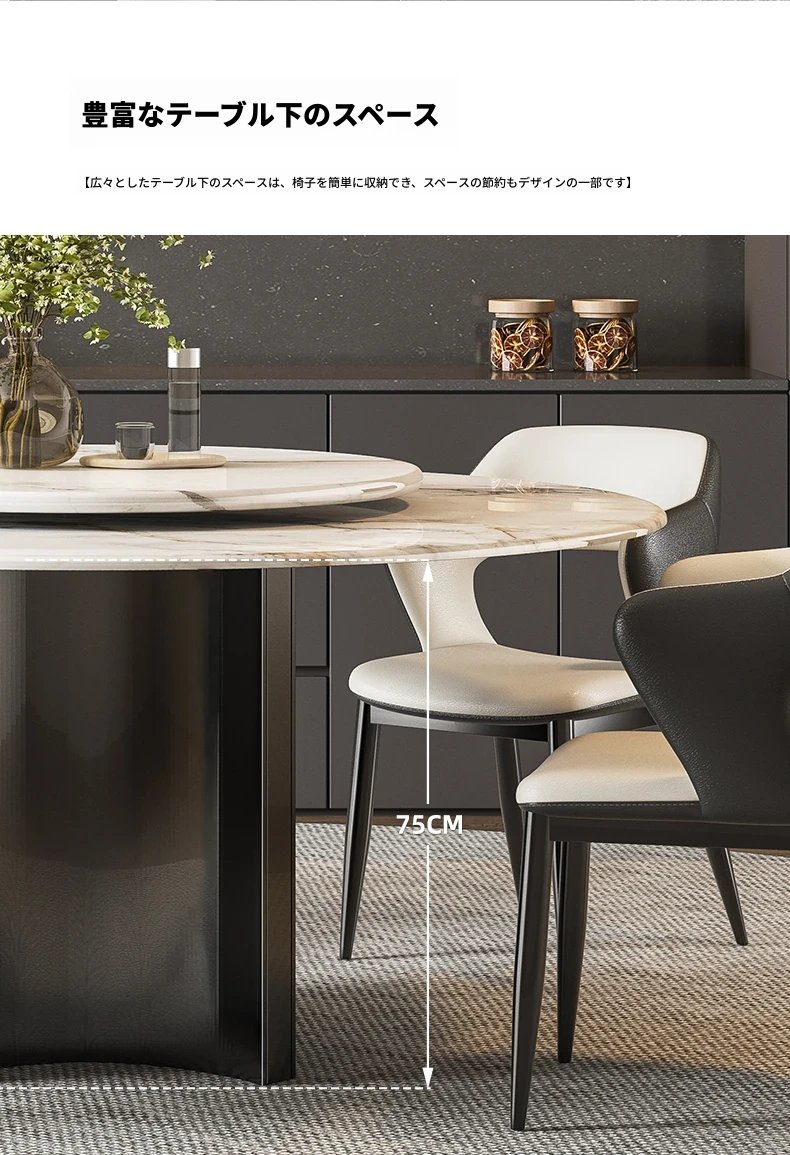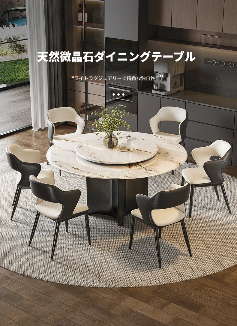 【アップグレード版複合全托】天然微晶石円形ダイニングテーブル+回転台+猫爪皮製ダイニングチェア*6