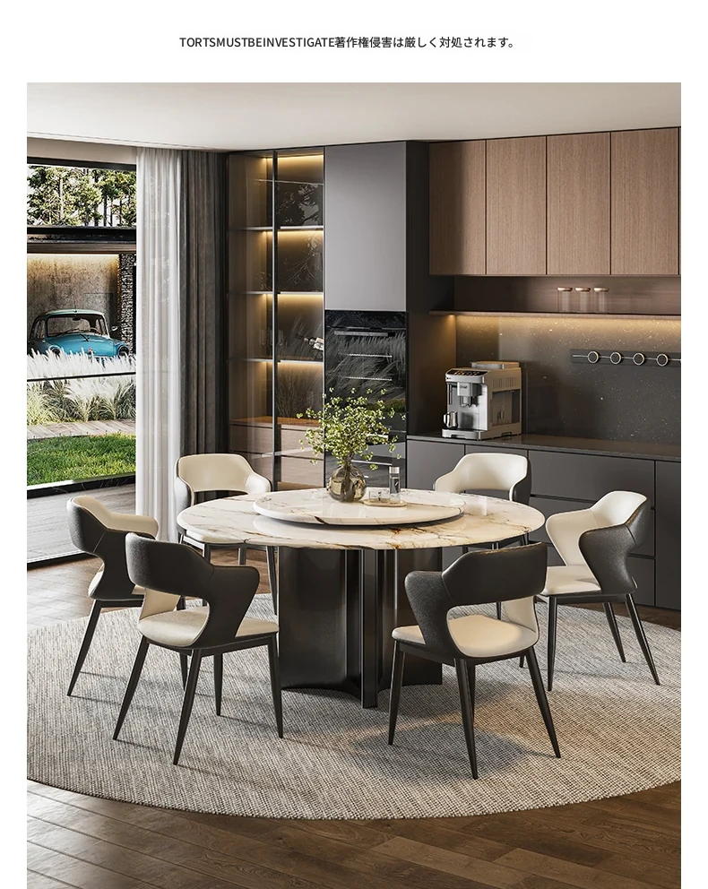 【アップグレード版複合全托】抗菌岩板ダイニングテーブル+回転台+猫爪皮製ダイニングチェア*6