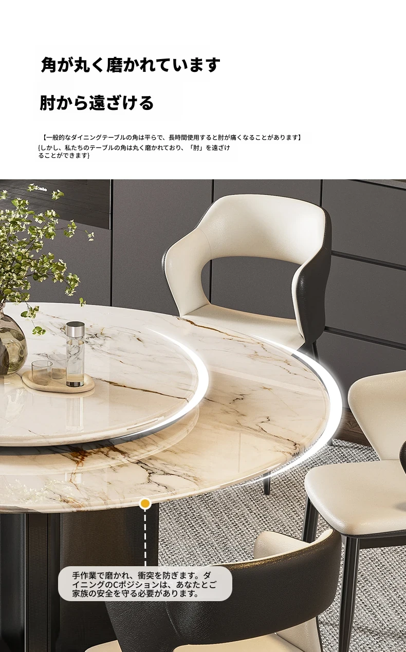 【アップグレード版複合全托】天然微晶石円形ダイニングテーブル+猫爪皮製ダイニングチェア*6