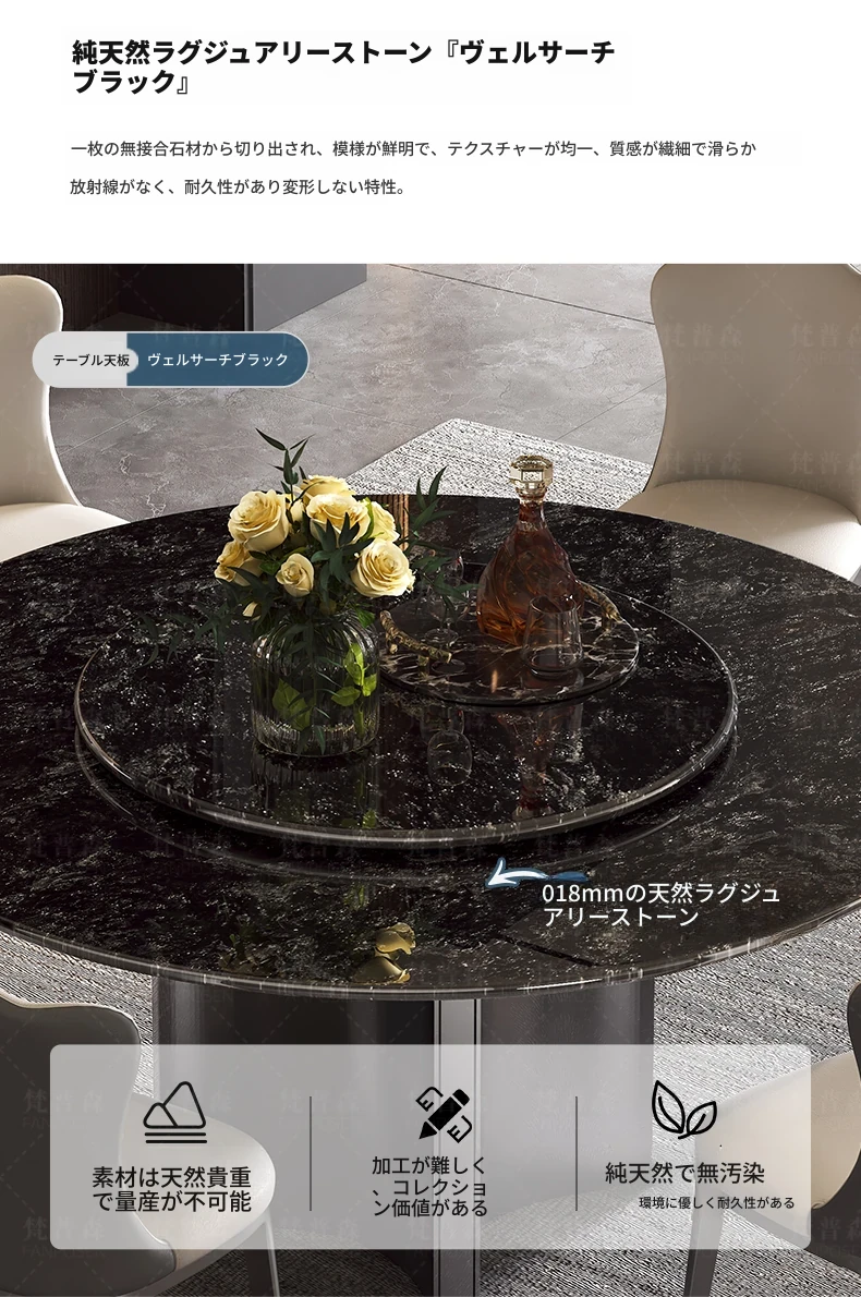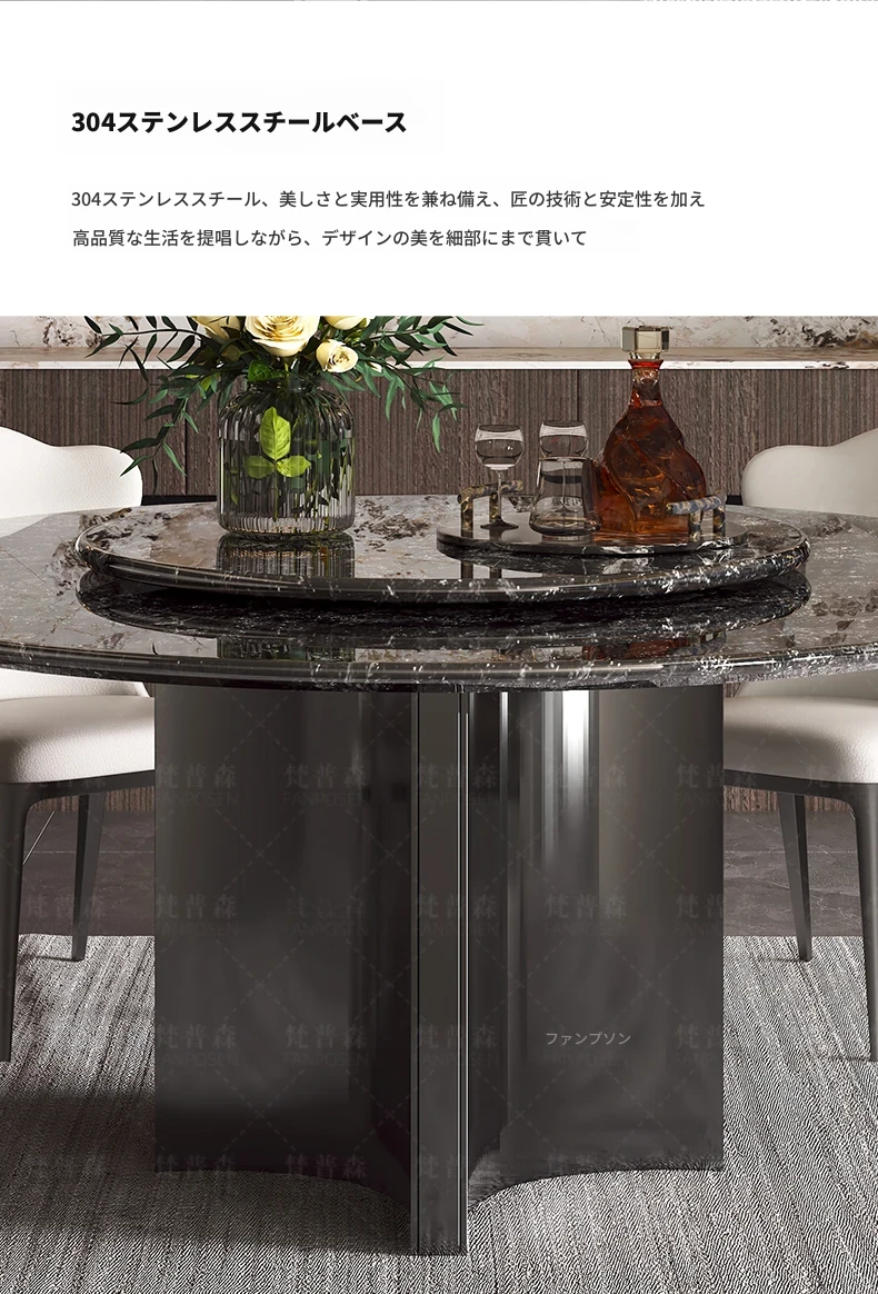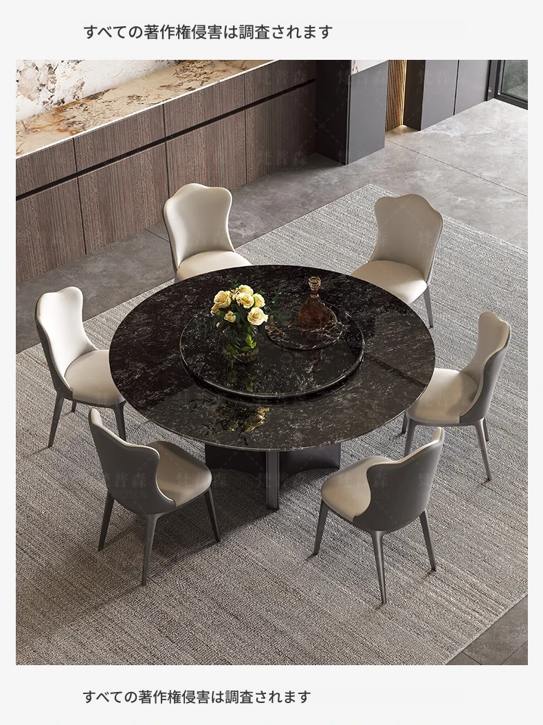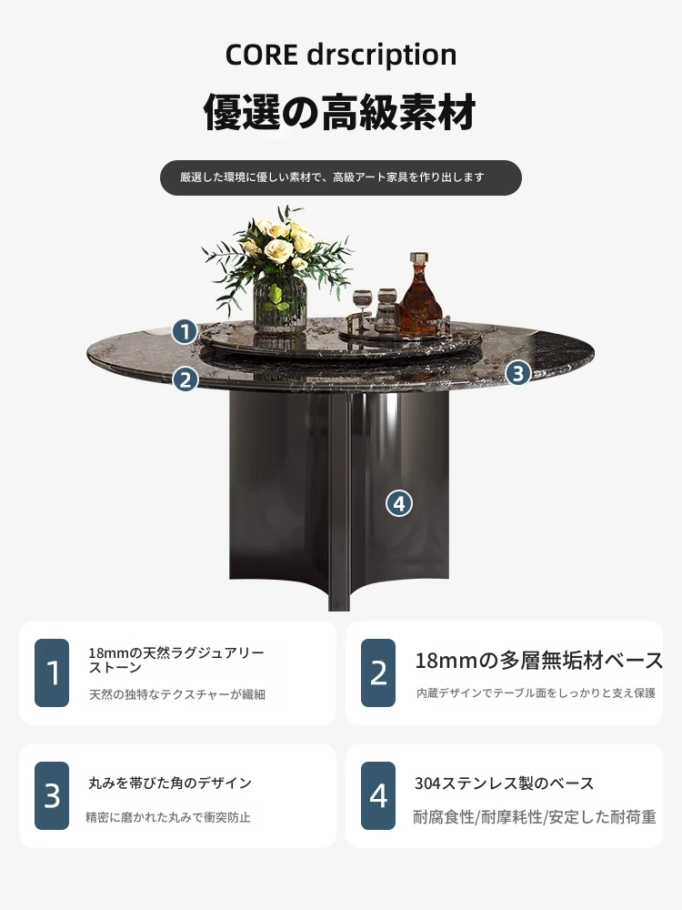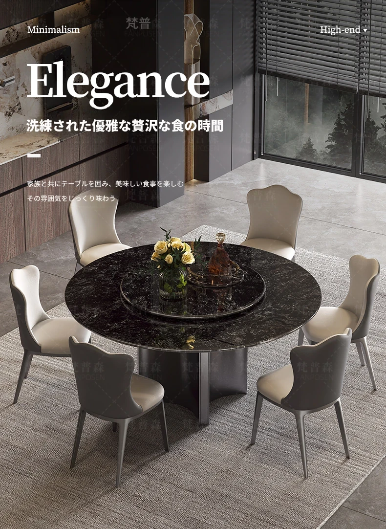 天然大理石使用のラグジュアリーなイタリアンスタイル円形ダイニングテーブル&チェアセット - ヴィラにぴったり、回転盤付きで使い勝手抜群!