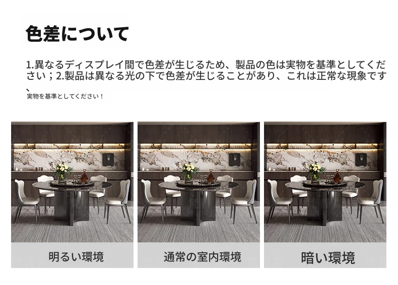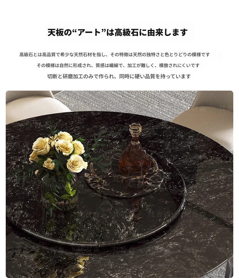 輸入されたファンシーな黒い天然石のダイニングテーブル+回転盤+本革ダイニングチェア*6