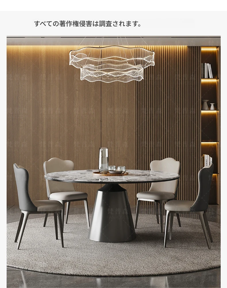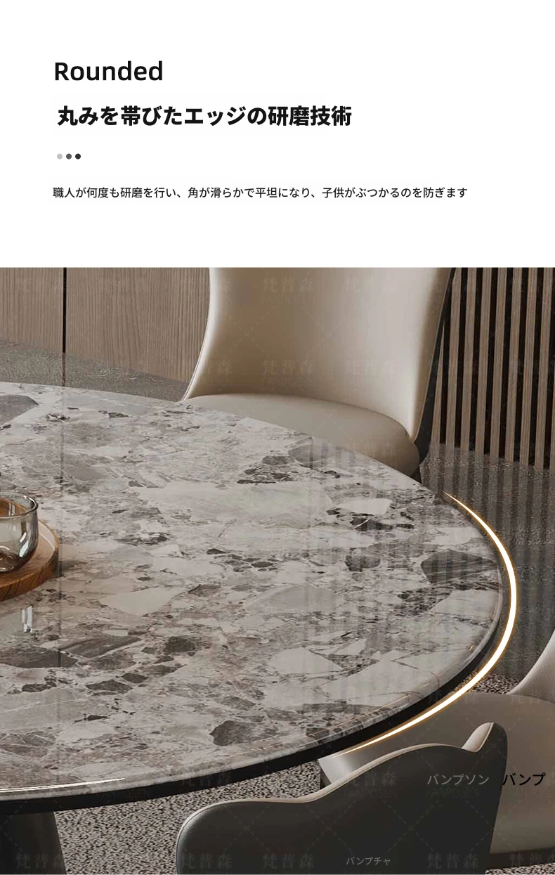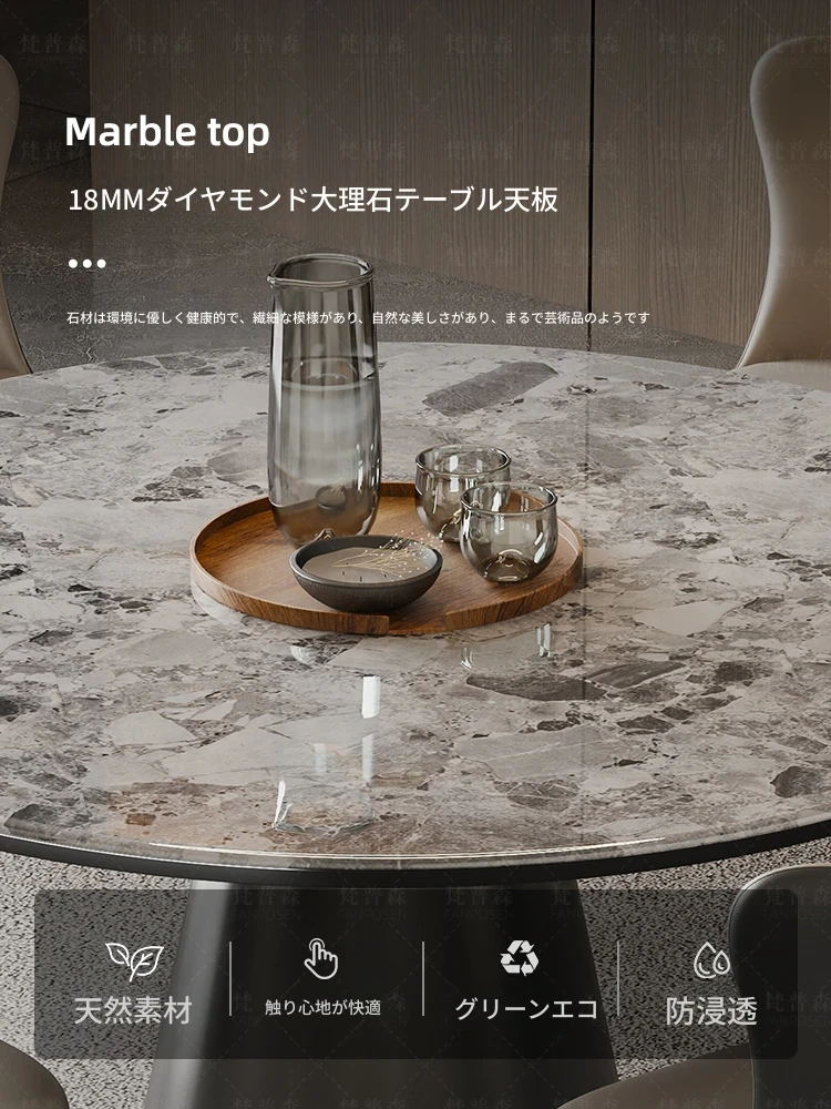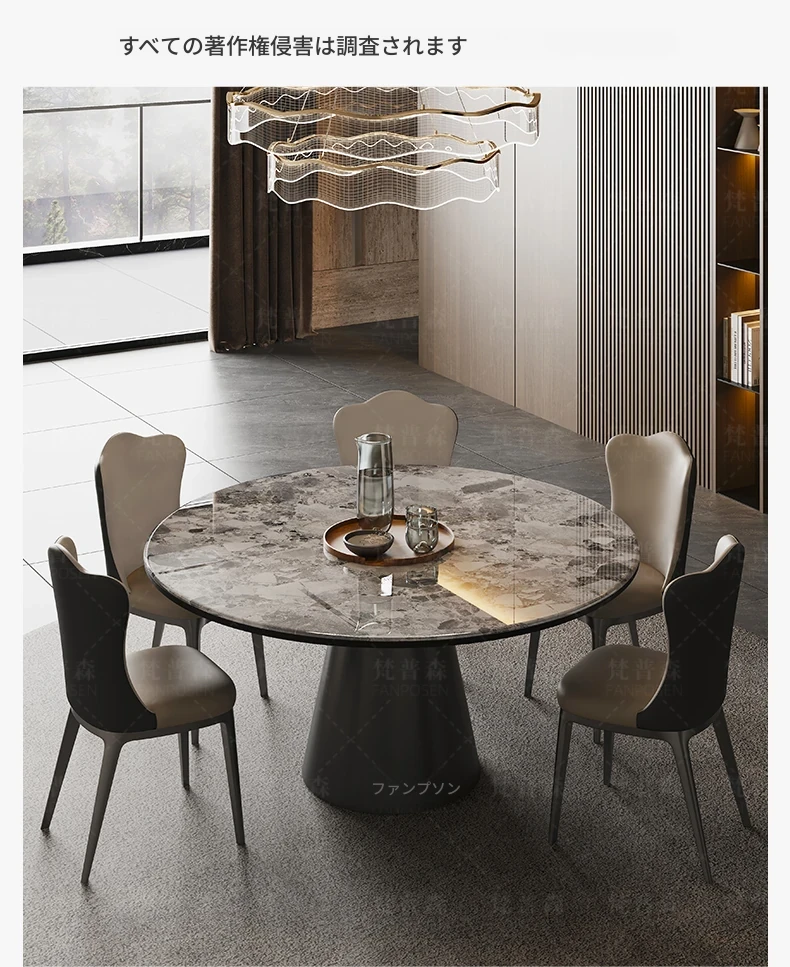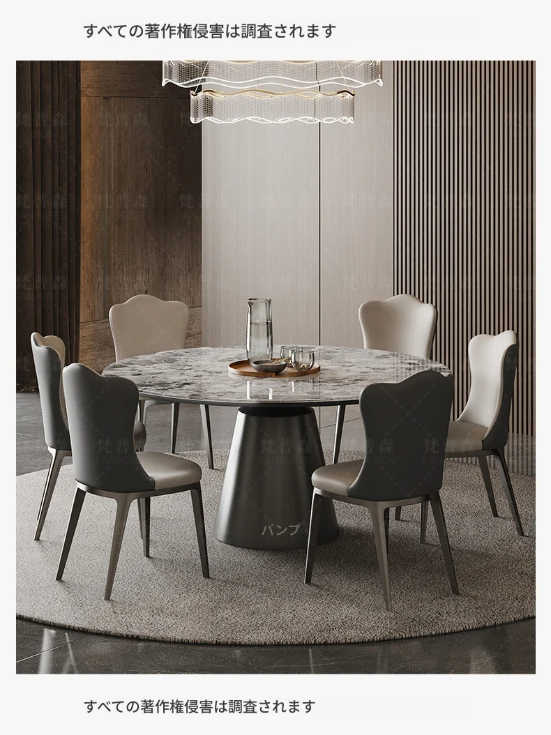 オレオグレー大理石円形ダイニングテーブル+回転プレート+特級猫抓皮ダイニングチェア*6