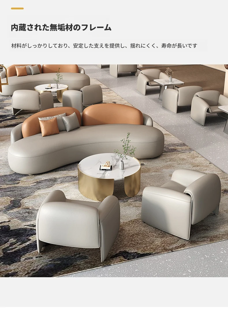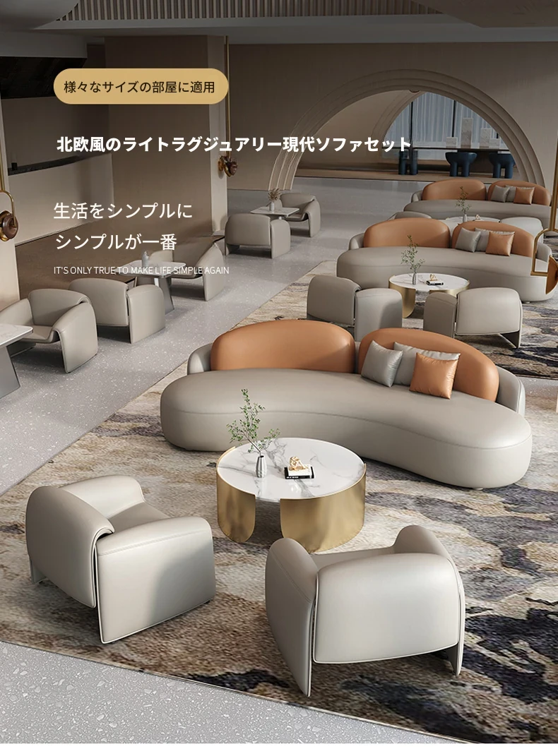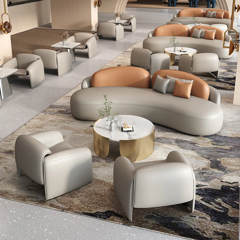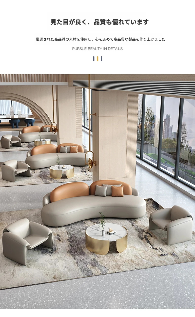 ビジネスホテルのエレガントなロビーで、VIPラウンジに最適な曲線デザインのソファ。接待や商談にぴったり、贅沢なひとときを提供します。