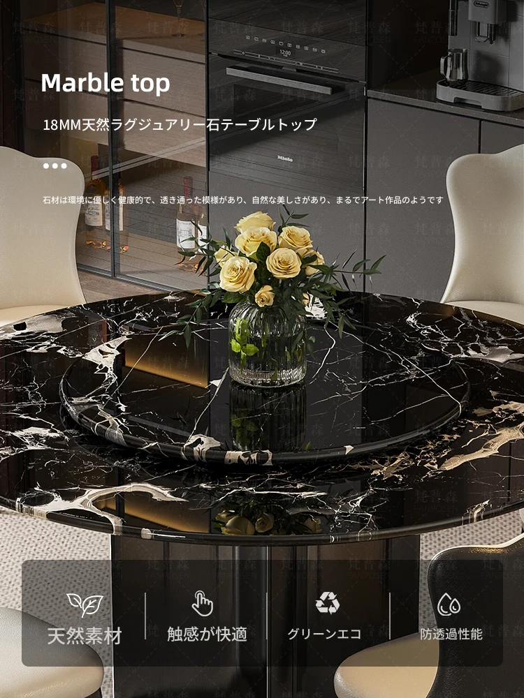 輸入黒バラ天然ラグジュアリー石円形ダイニングテーブル+回転台+本革ダイニングチェア*6