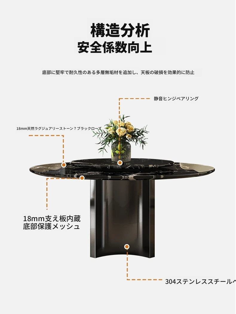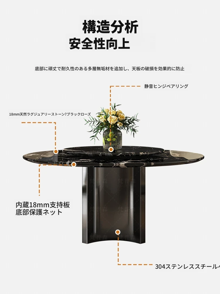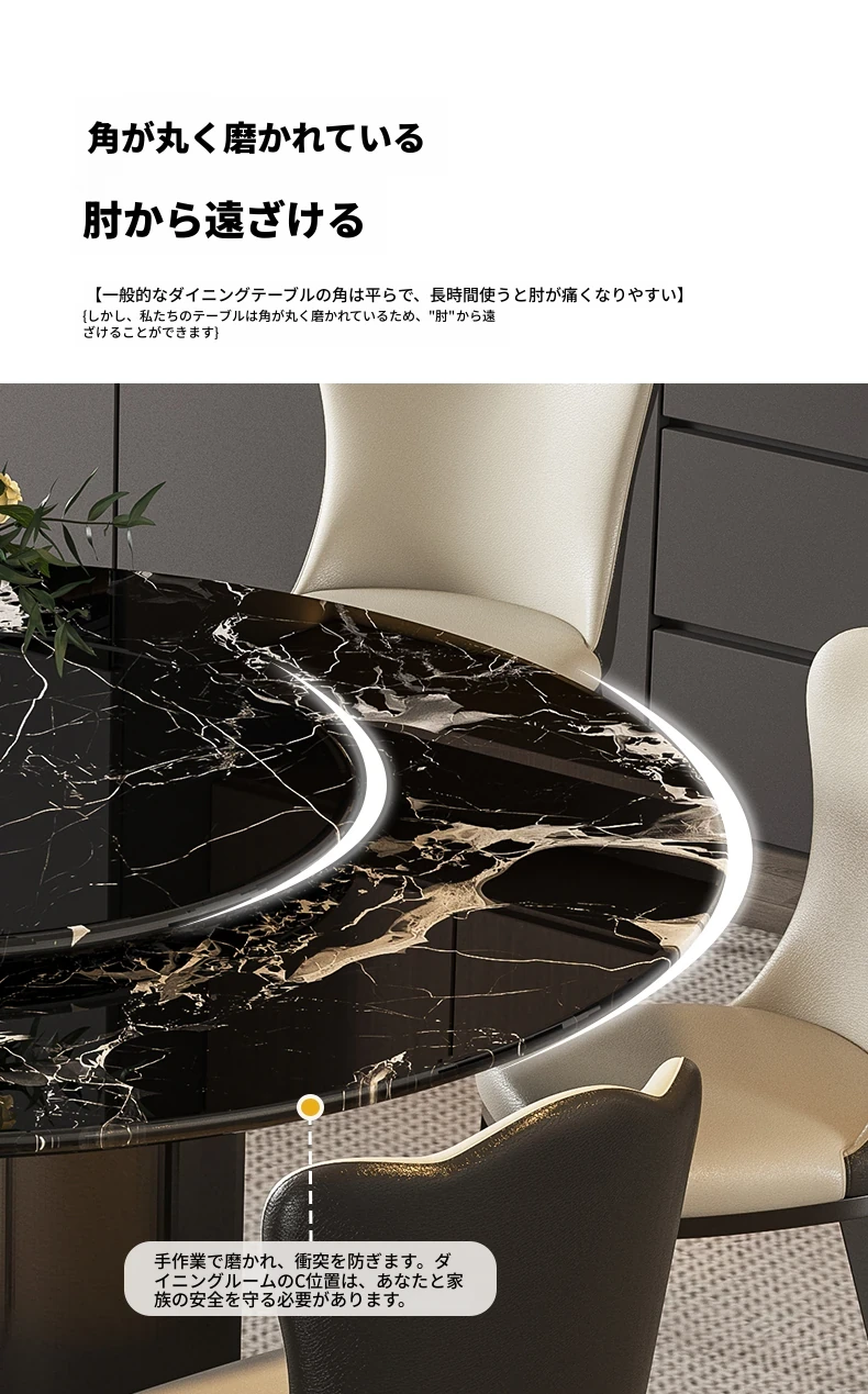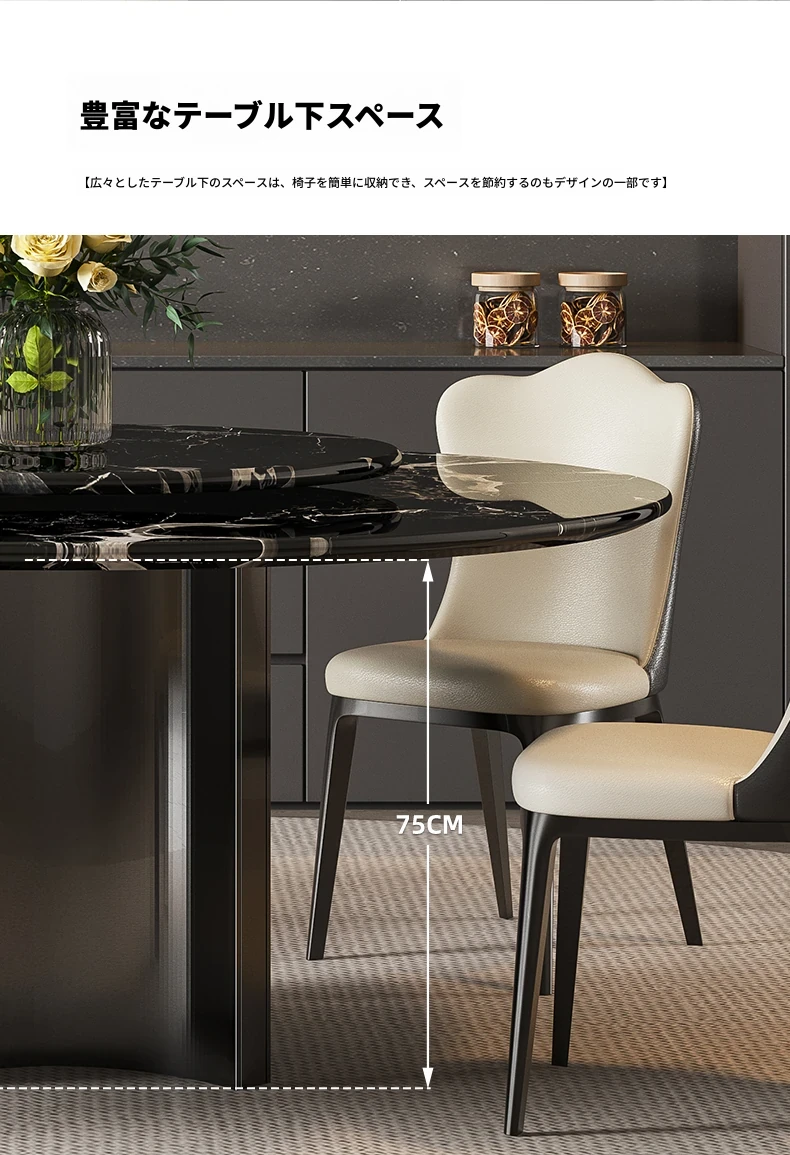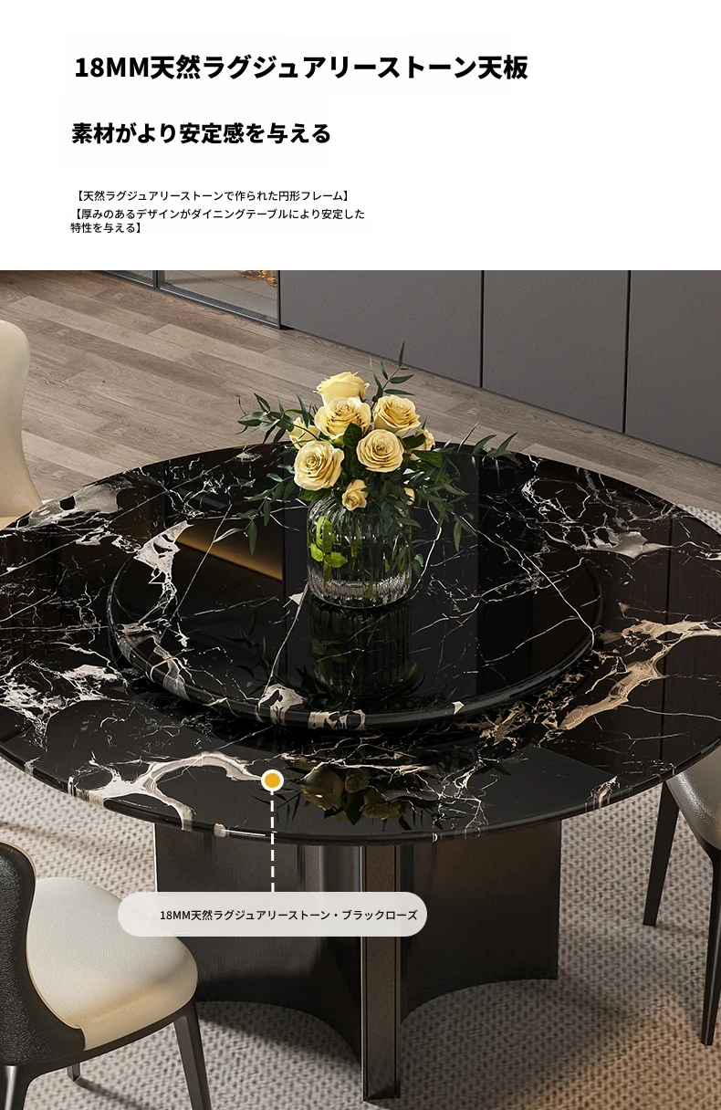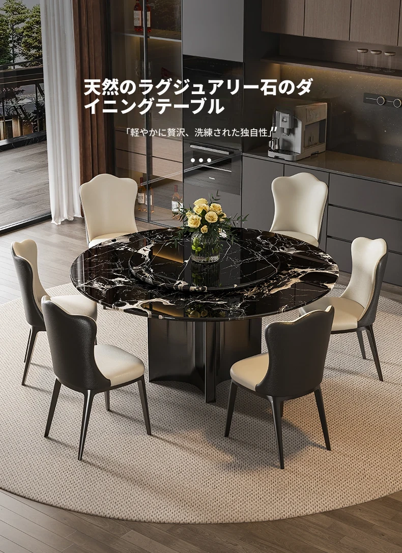 輸入黒バラ天然ラグジュアリー石円形ダイニングテーブル+本革ダイニングチェア*6