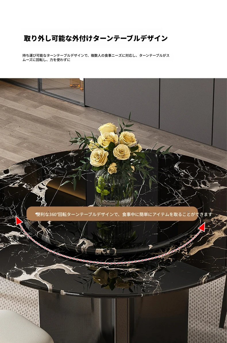 輸入黒バラ天然ラグジュアリー石円形ダイニングテーブル+回転台+本革ダイニングチェア*4