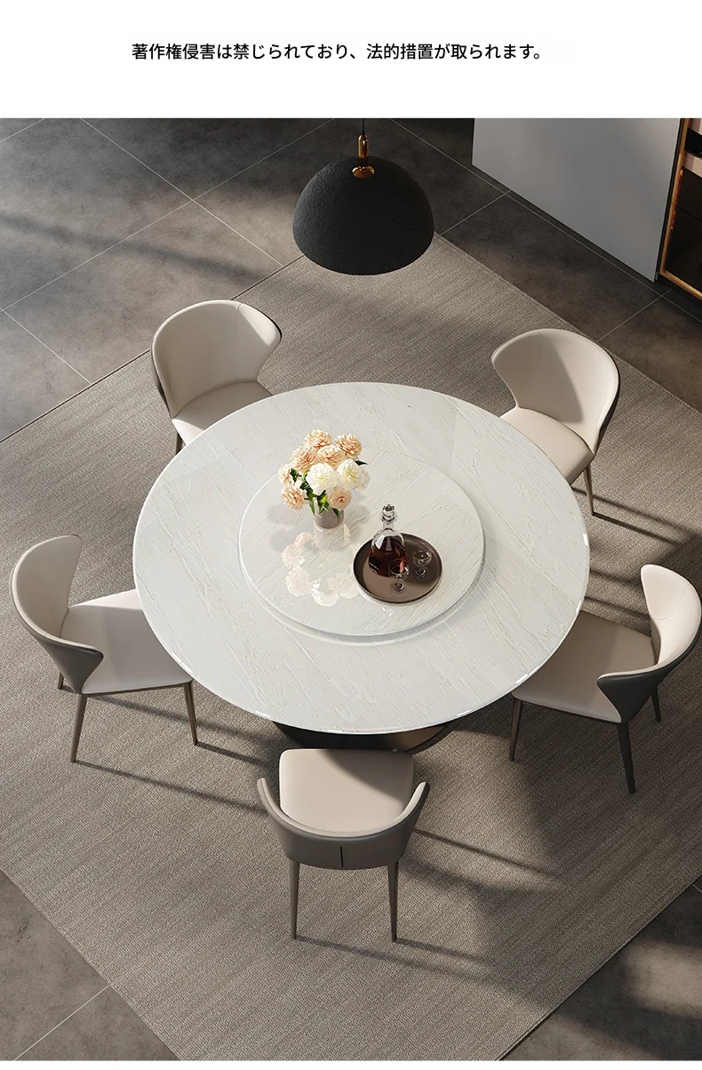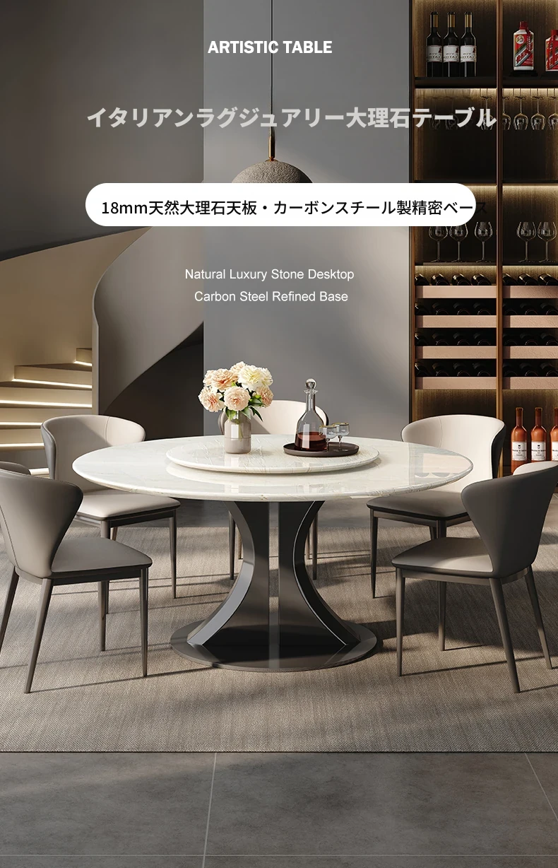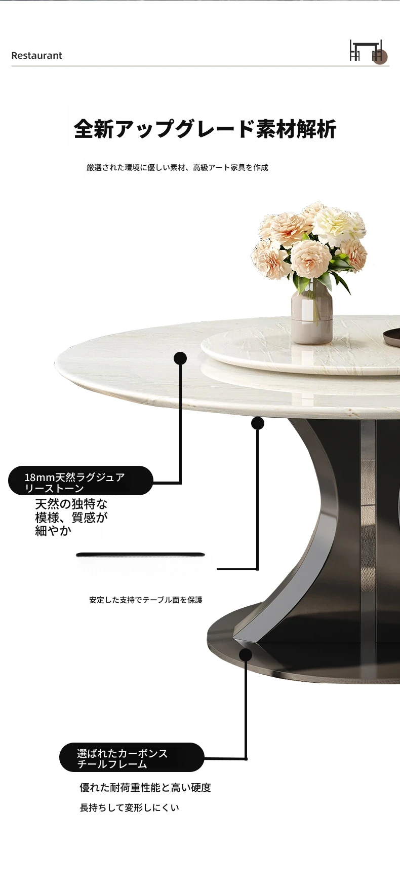【輸入】S級カリアイス玉天然ラグジュアリーストーン円形ダイニングテーブル+回転盤+本革ダイニングチェア*6