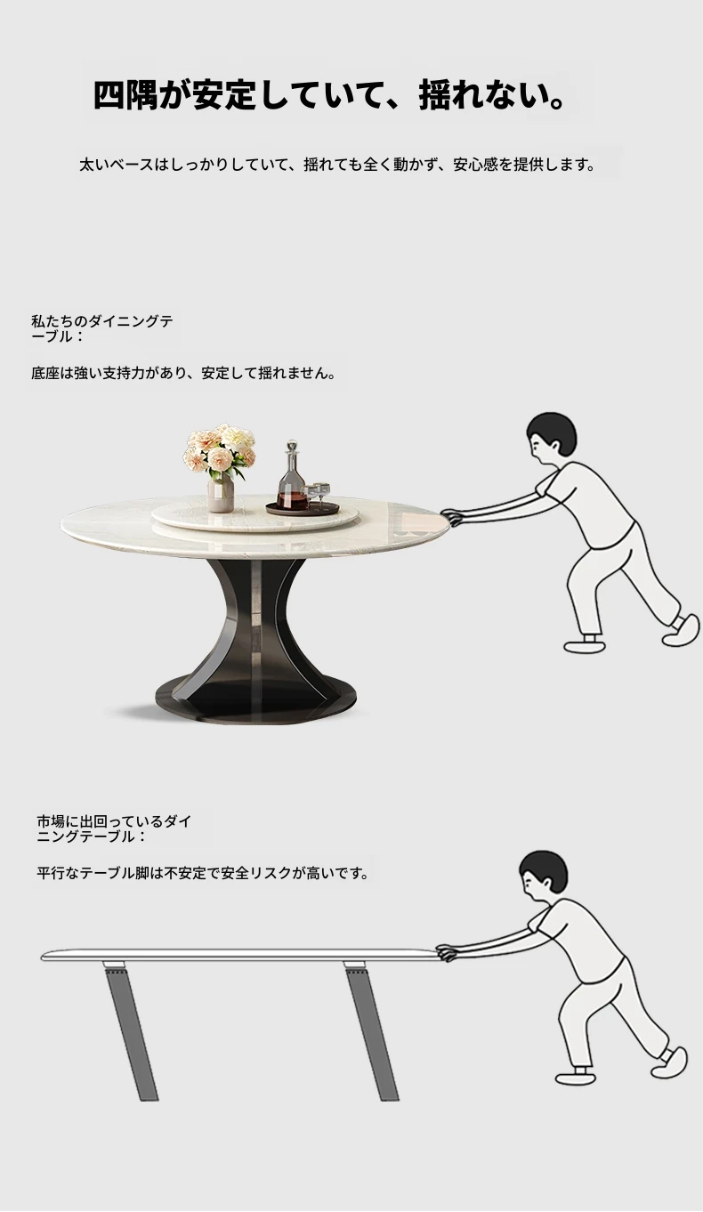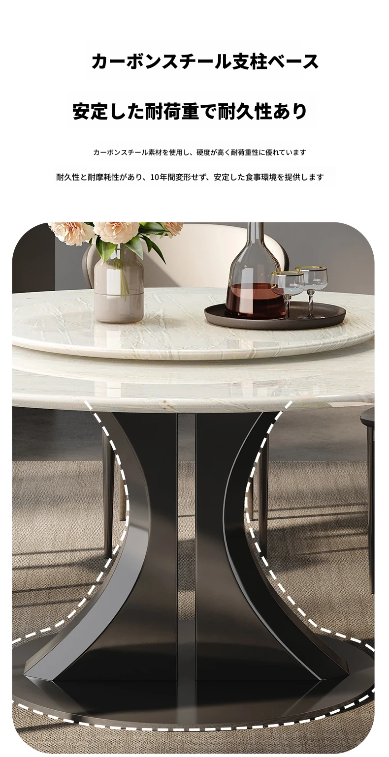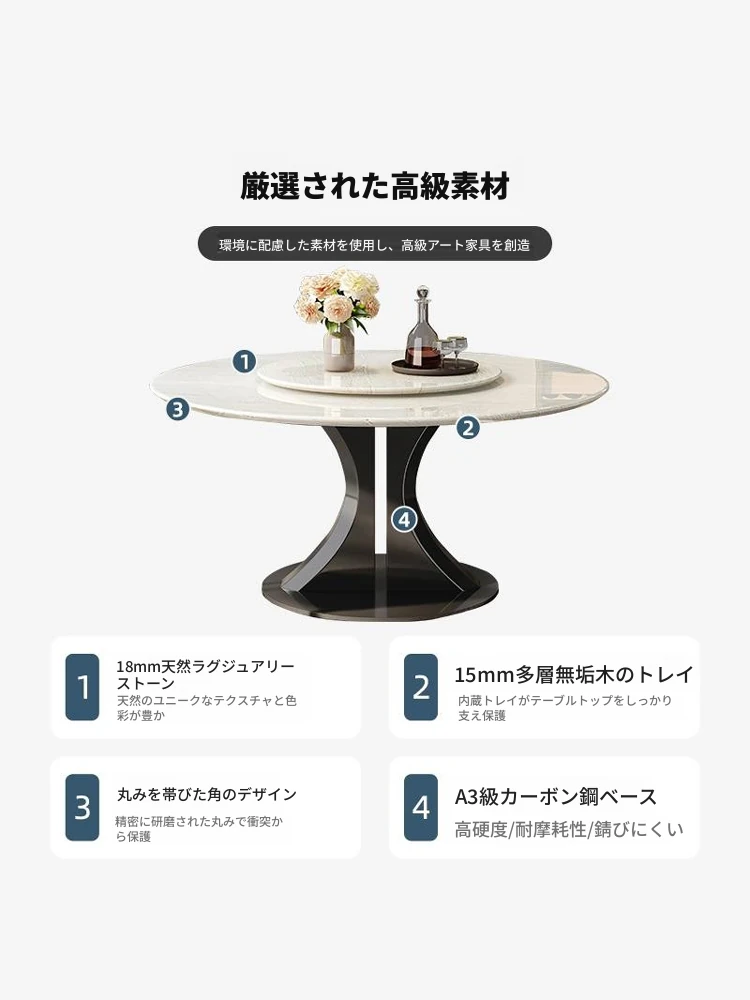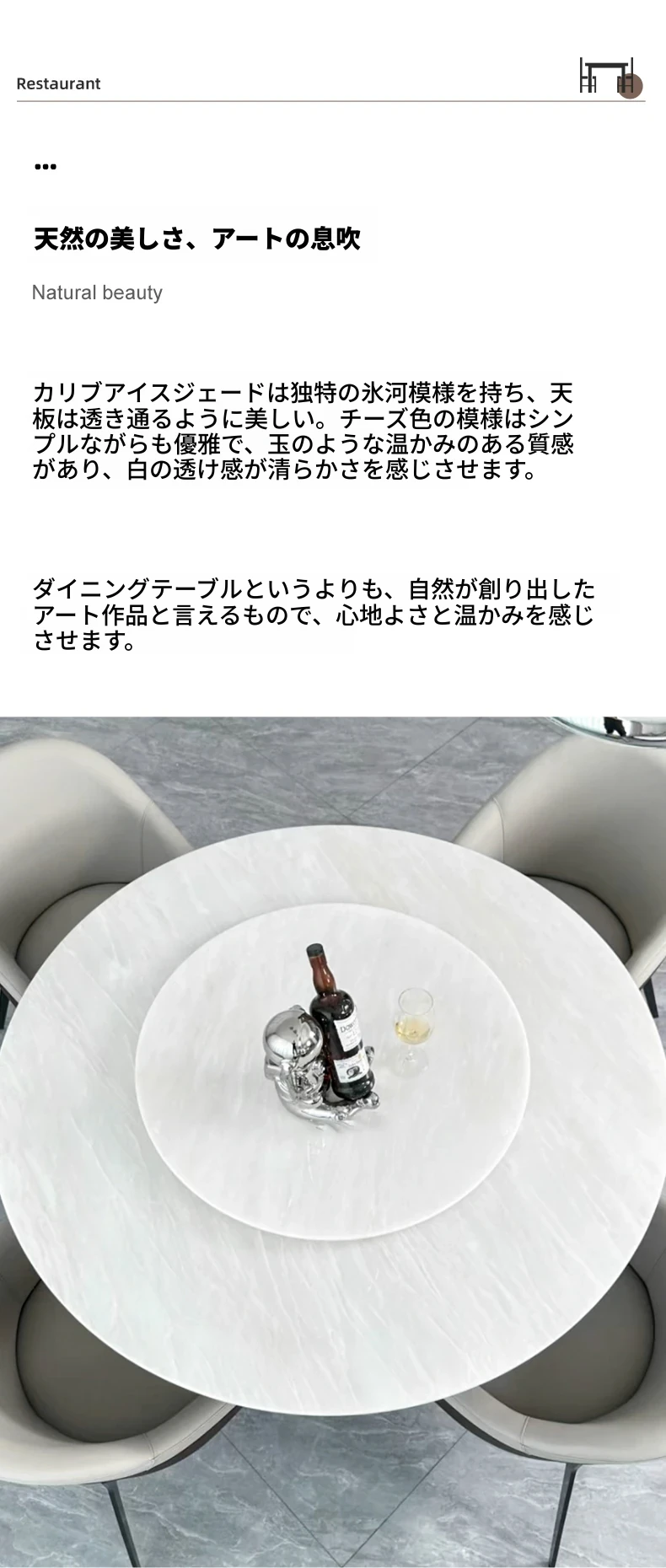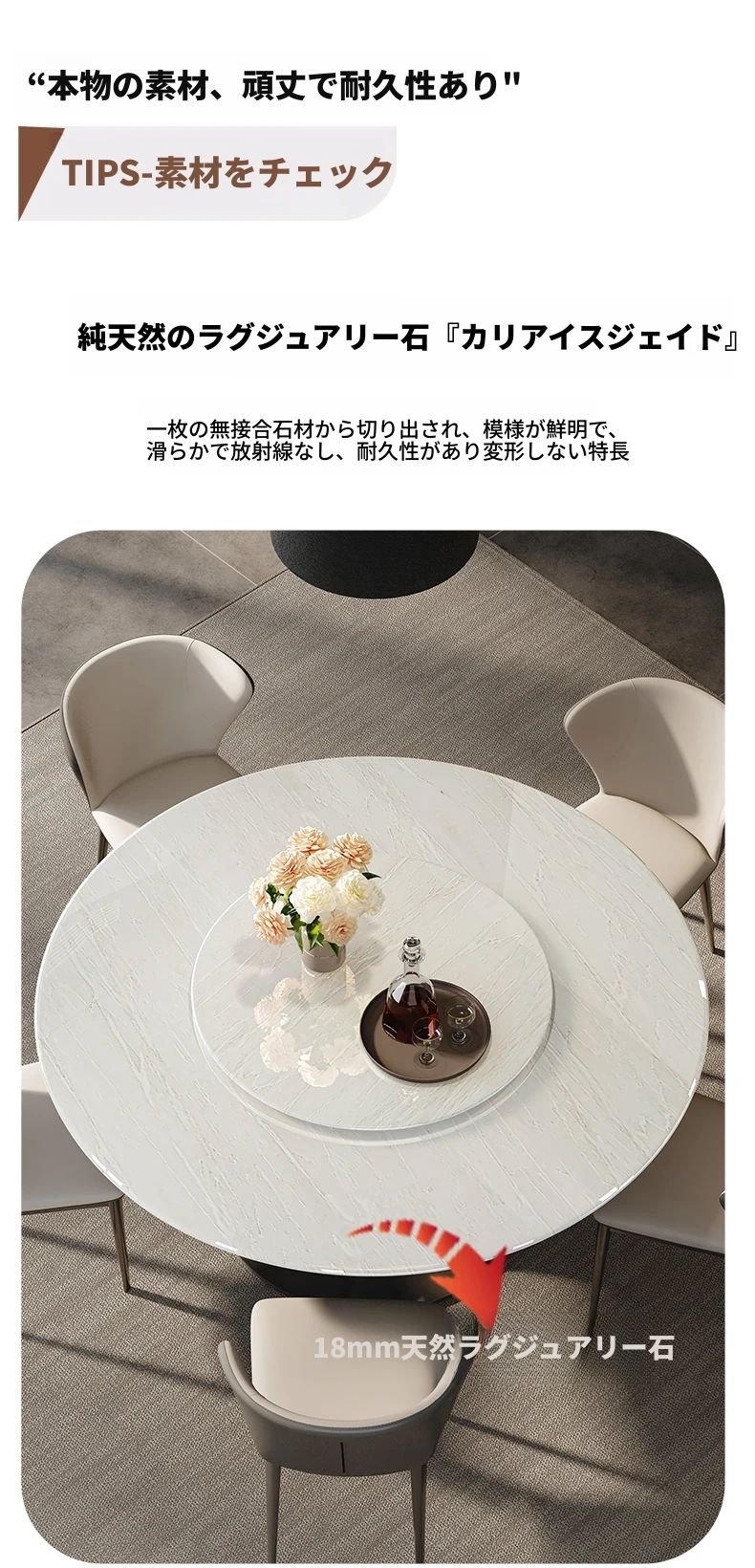 【輸入】S級カリアイス玉天然ラグジュアリーストーン円形ダイニングテーブル+回転盤+本革ダイニングチェア*4