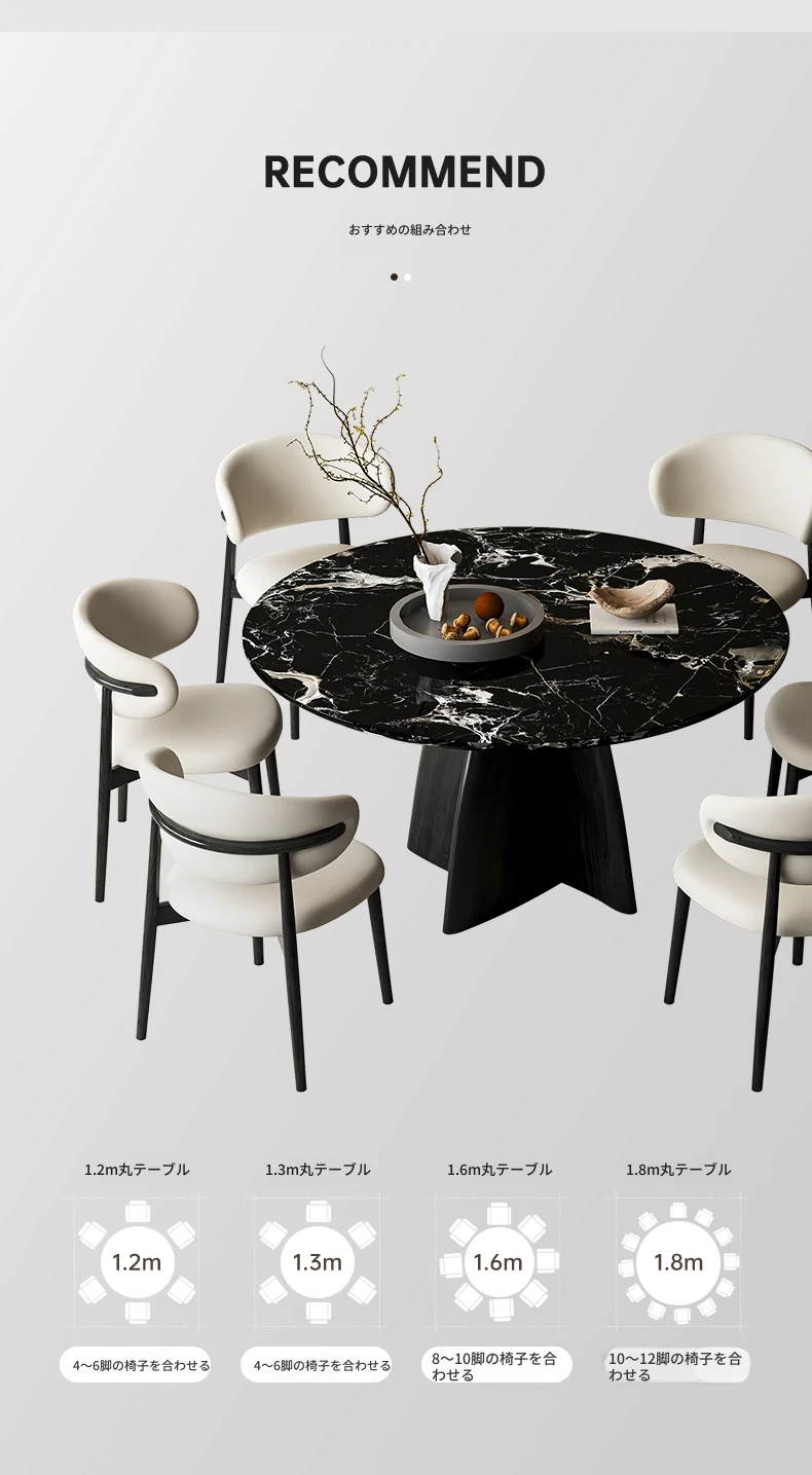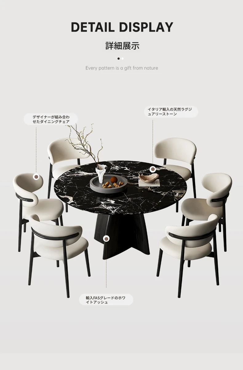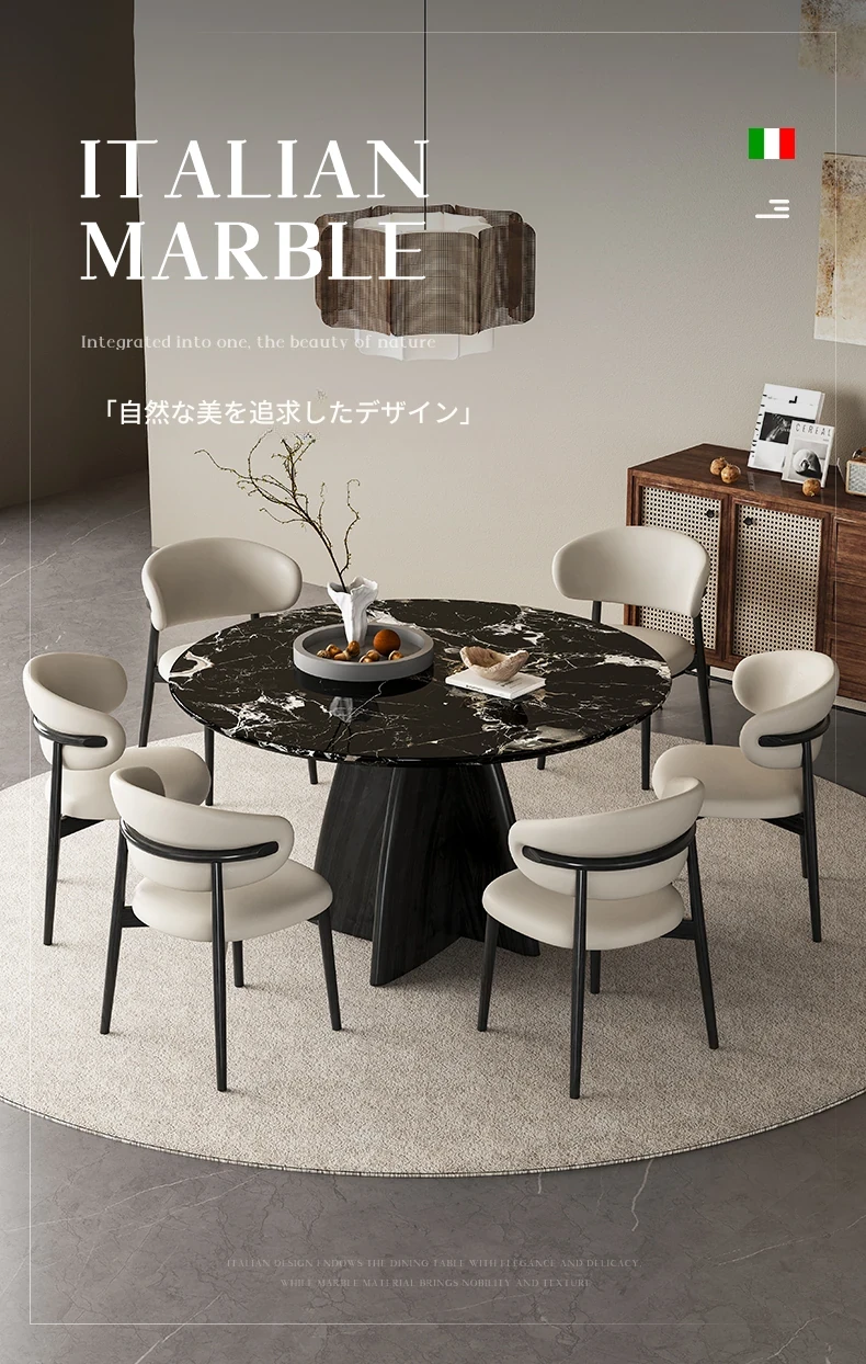 ブラックローズ豪華石製ダイニングテーブル+回転盤+カジュアルチェア*6