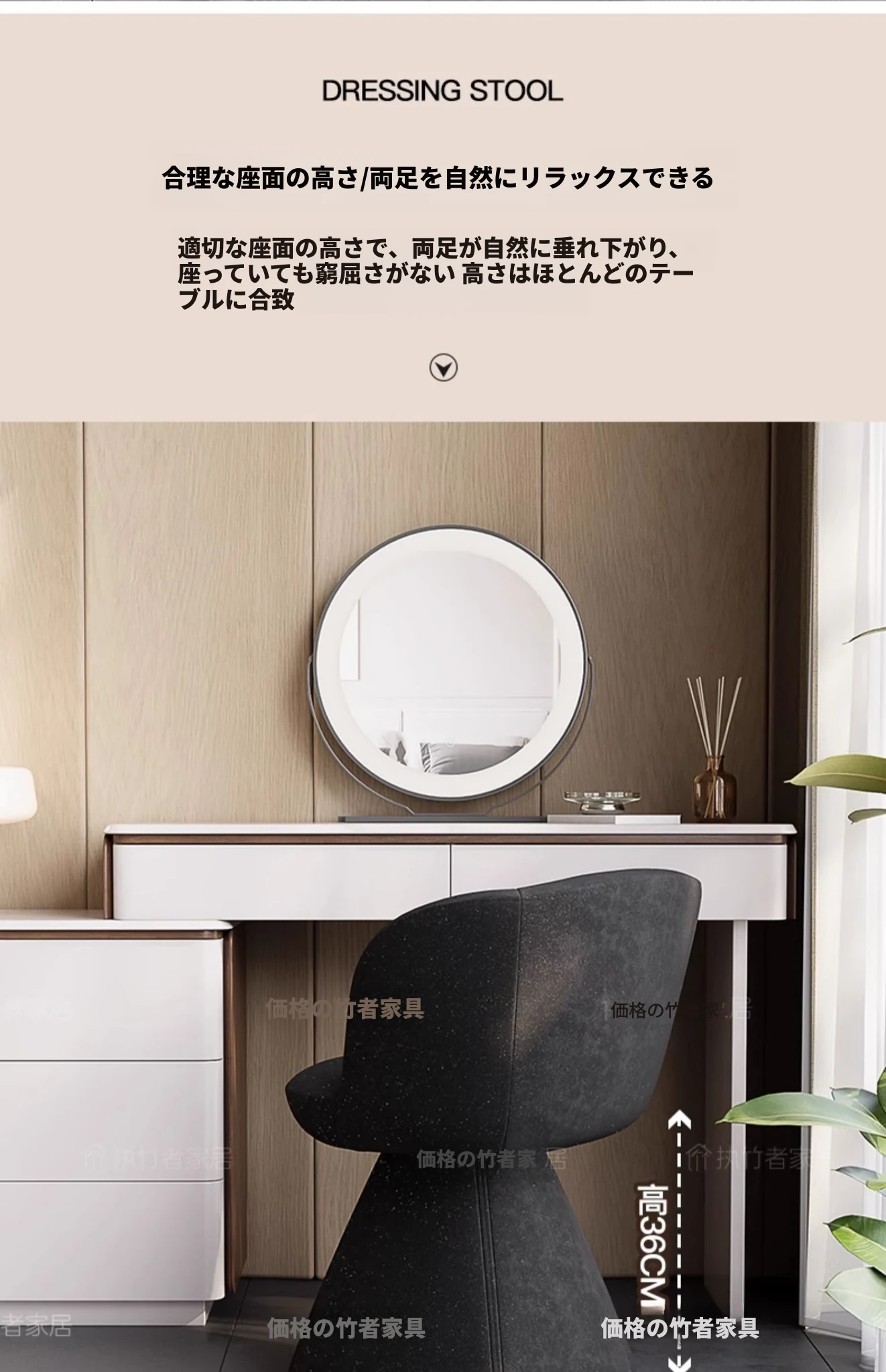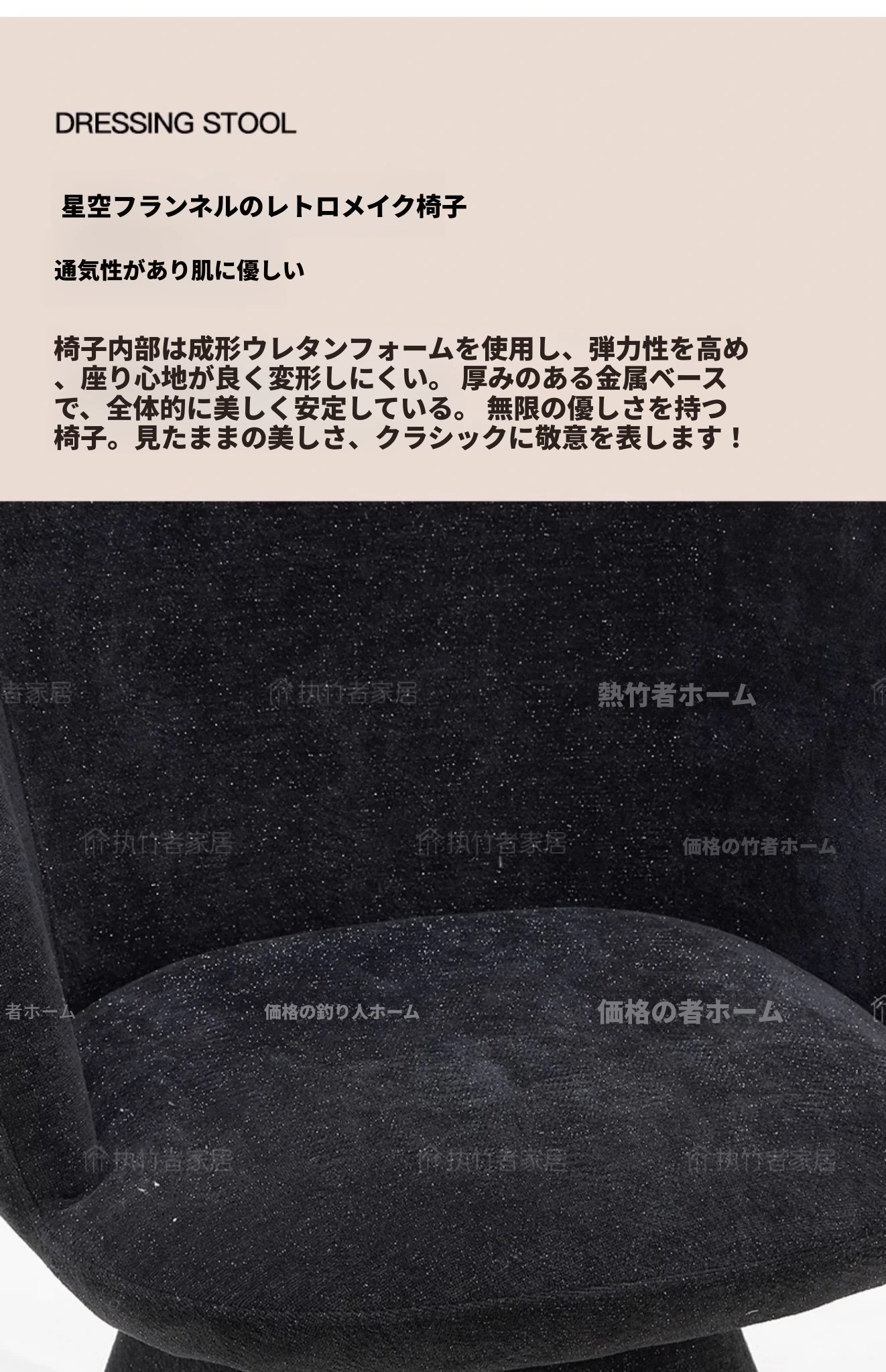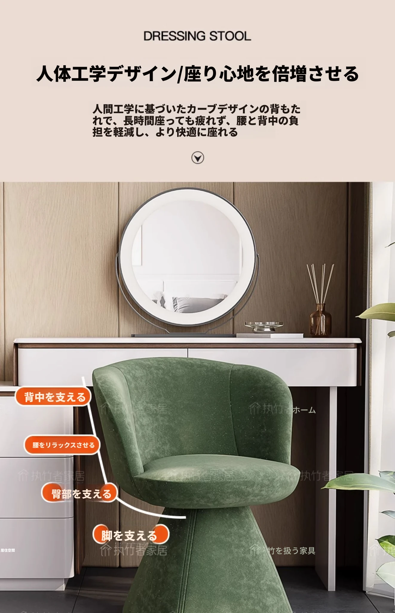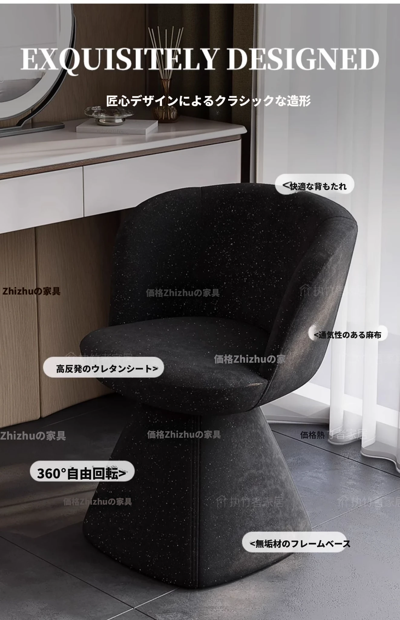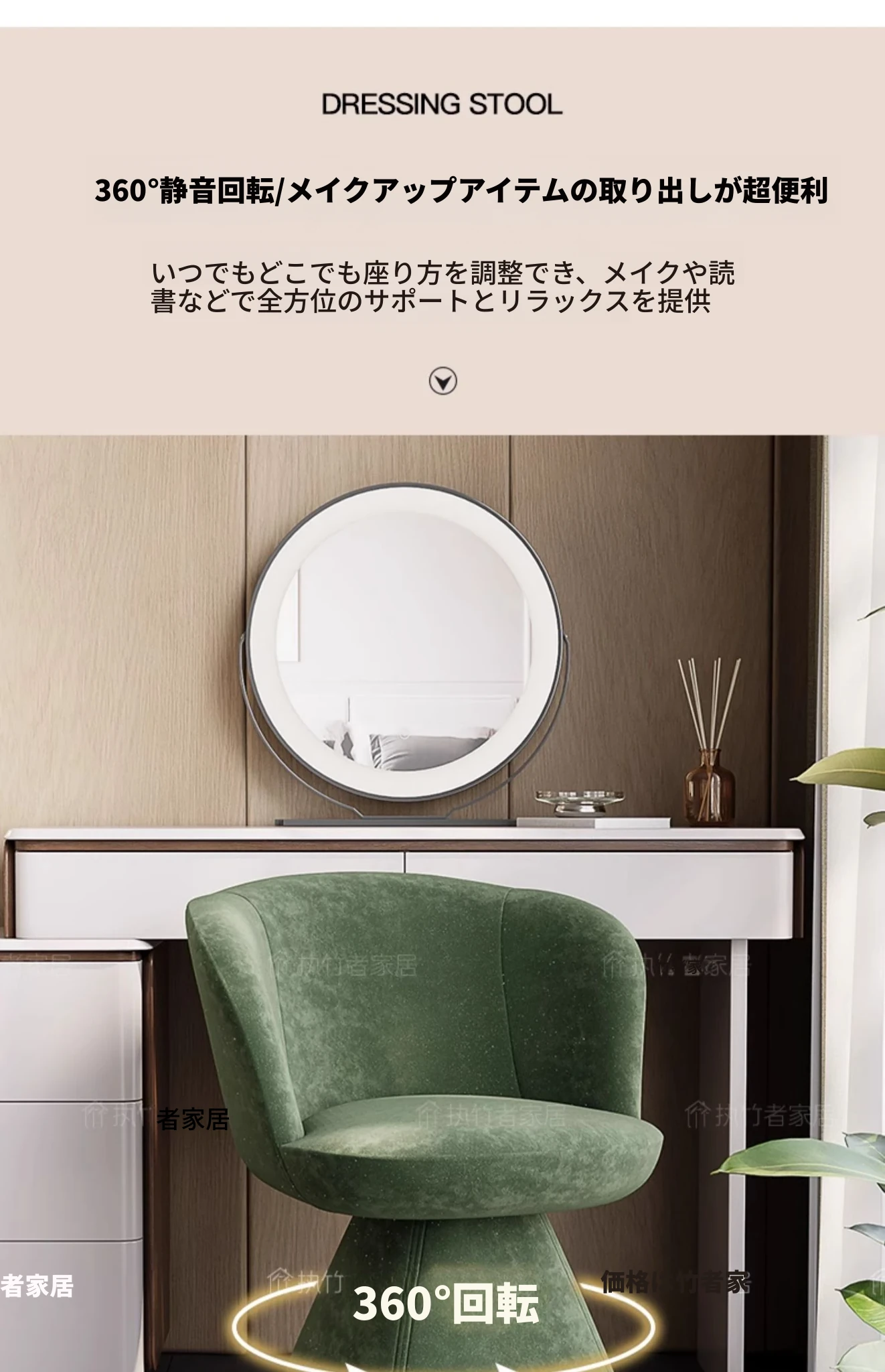 北欧デザインの高級化粧椅子 - 回転式バックレスト付き、洗練された軽奢スタイル。自宅の化粧台に最適な、快適でスタイリッシュなコスメチェア。あなたの美しさを引き立てるアイテム!