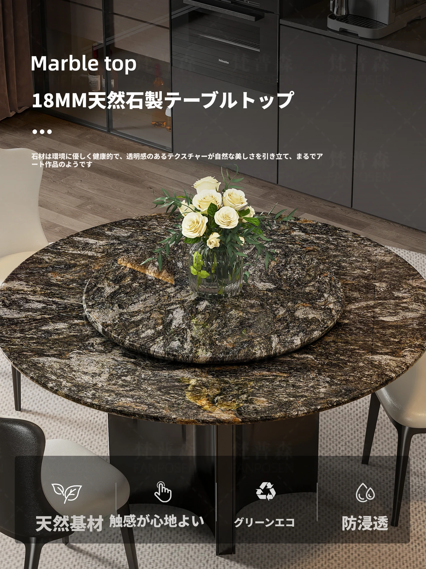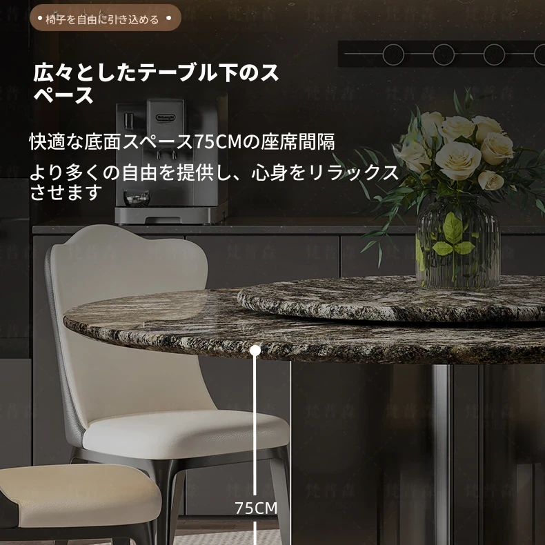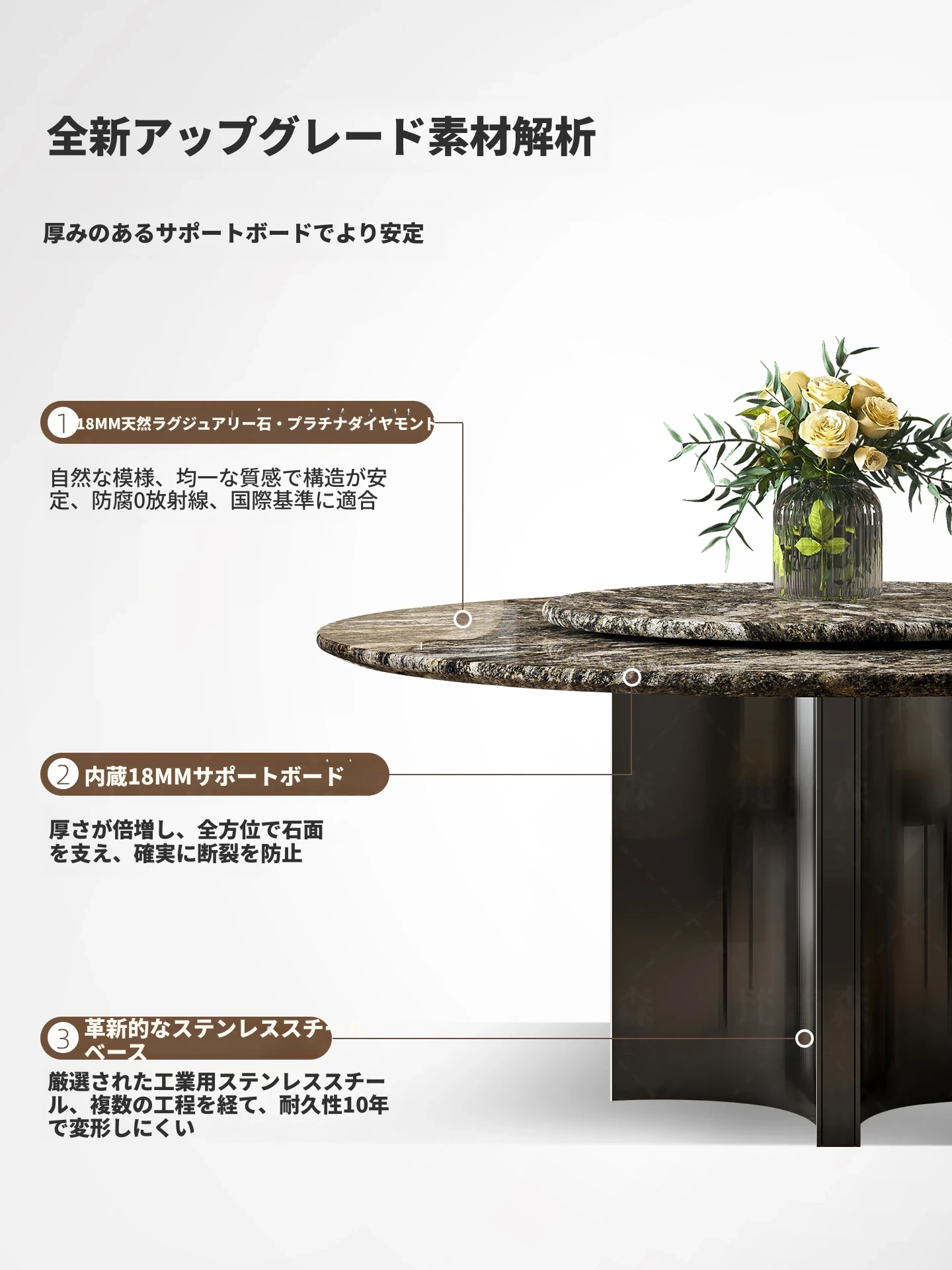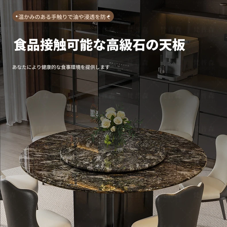 輸入プラチナダイヤモンド天然ラグジュアリー石ダイニングテーブル+ターンテーブル+本革ダイニングチェア*6