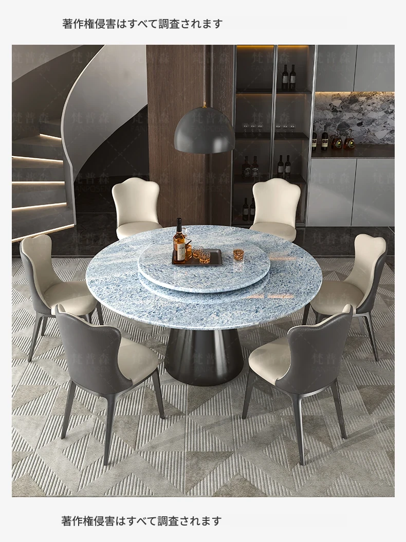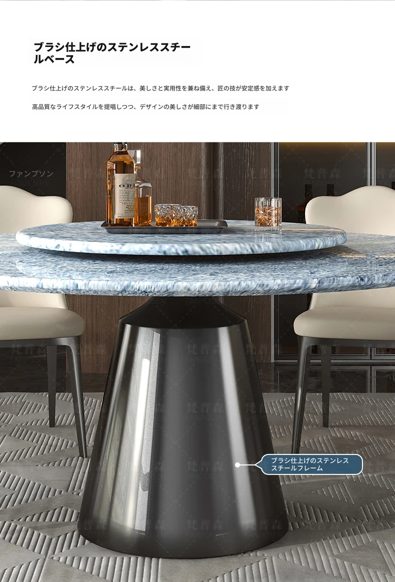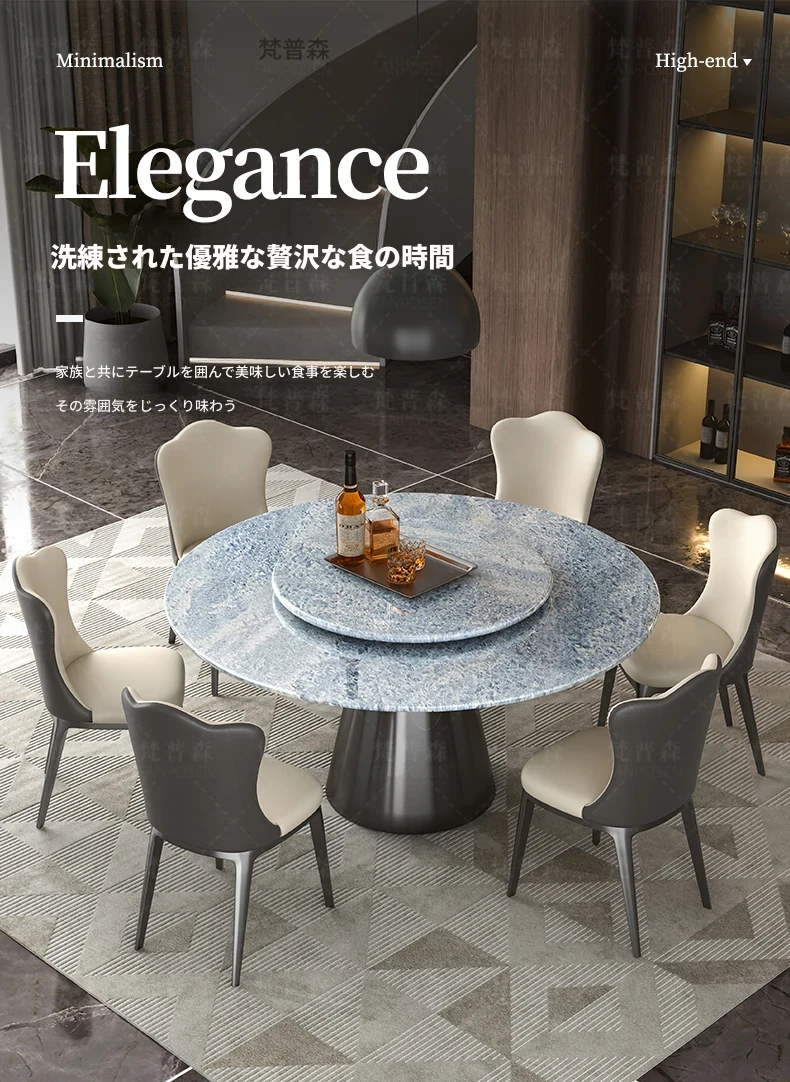 ヴァンプソン輸入ブルークリスタル高級天然大理石円形ダイニングテーブルセット、回転プレート付きでエレガントな食事体験をお届けします。