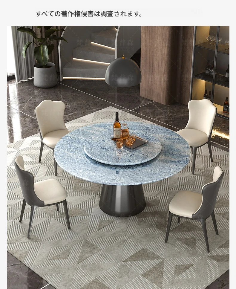 輸入ブルークリスタル天然ラグジュアリーストーンダイニングテーブル+回転盤+本革ダイニングチェア*4 【偽物は10倍返し】