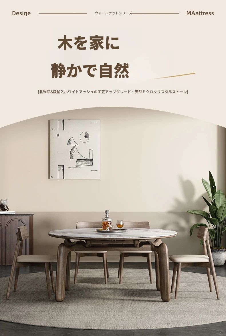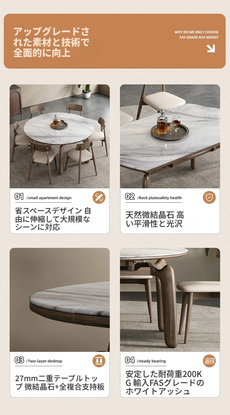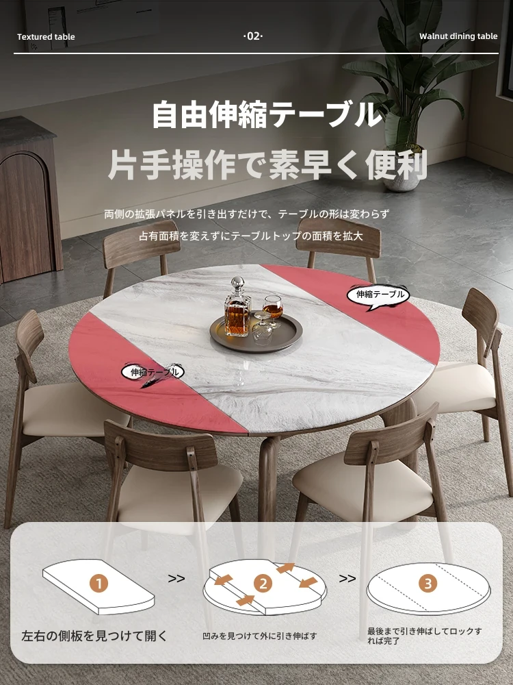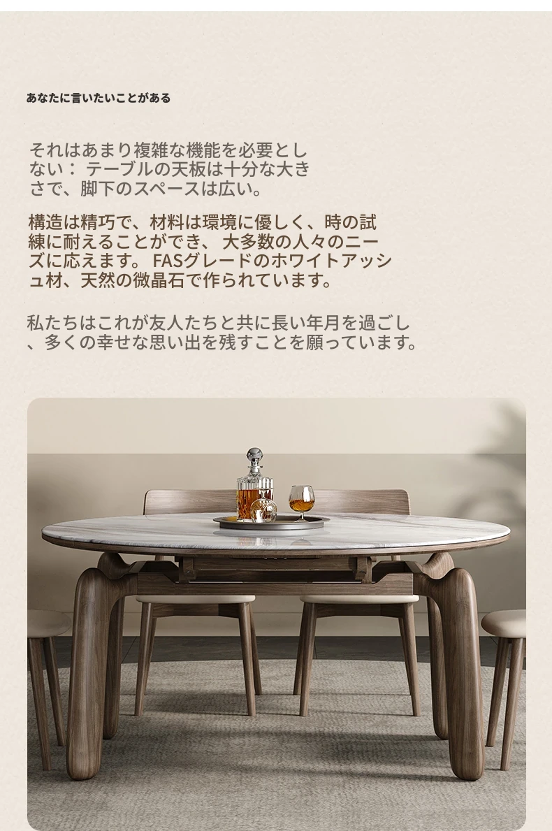 ヴァンプソン天然大理石のダイニングテーブル - 四角から丸に変形!現代的で高級感あふれるデザイン、無垢材とミクロクリスタルストーンの組み合わせで、食卓をスタイリッシュに演出します。