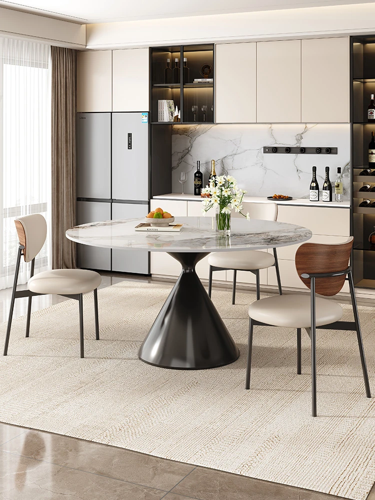 軽奢感漂う現代的な円形岩板ダイニングテーブル&チェアセット!シンプルでスタイリッシュなデザイン、電磁炉と一体化した便利な回転プレートで、家庭でも商業利用にも最適です。おしゃれな食卓を演出しましょう!