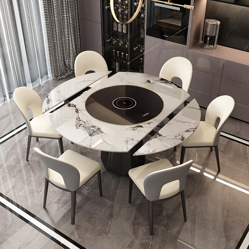 新作!2025年版イタリアンラグジュアリー岩板サークルダイニングテーブル - 回転式・伸縮機能付き、内蔵ターンテーブル&多機能電磁調理器搭載!フオサン製、スタイリッシュで便利な食卓をお楽しみください!