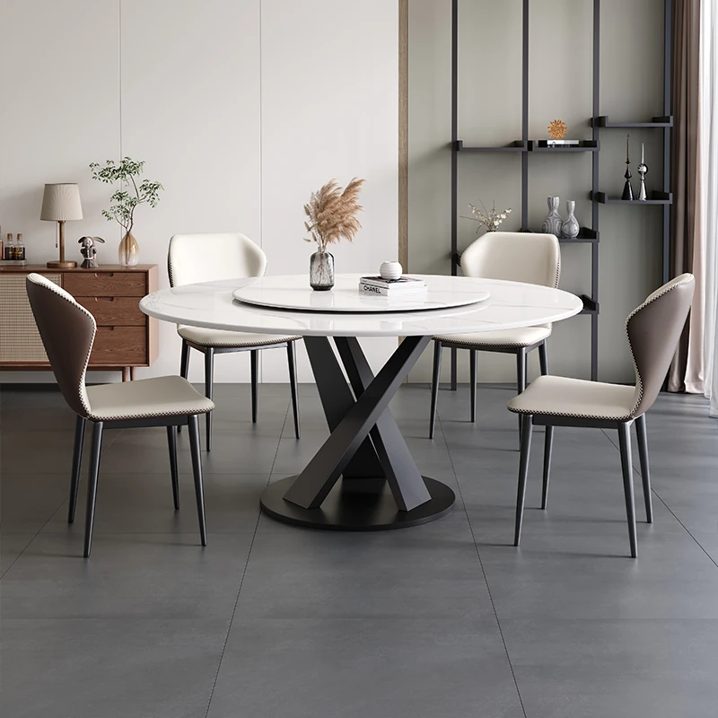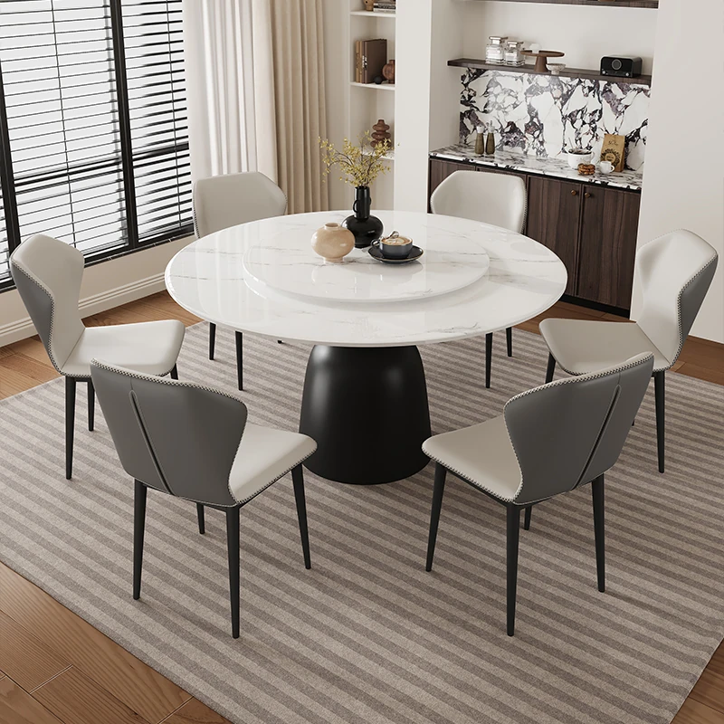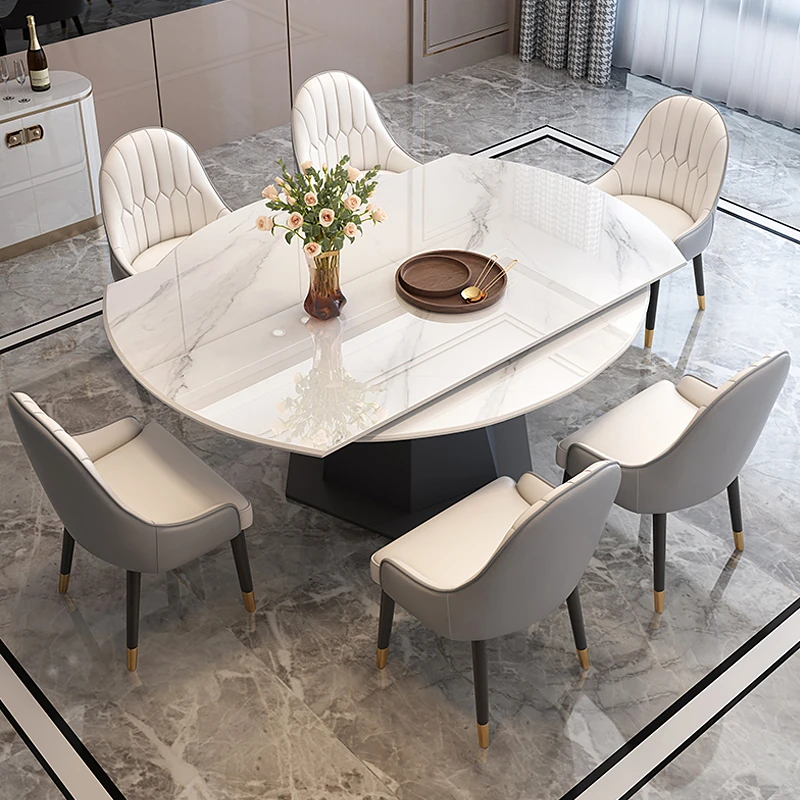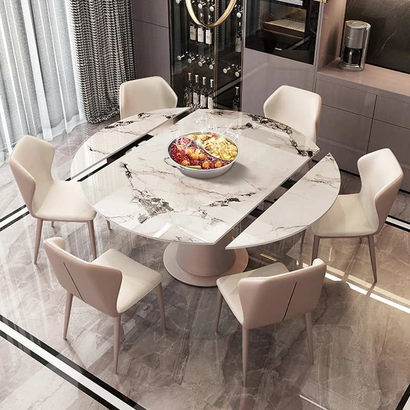 イタリアンミニマリズムの岩板ダイニングテーブル&チェアセット 北欧風のスクエア&ラウンド両用、伸縮可能&回転式の円形テーブルで、食事をより特別な時間に!