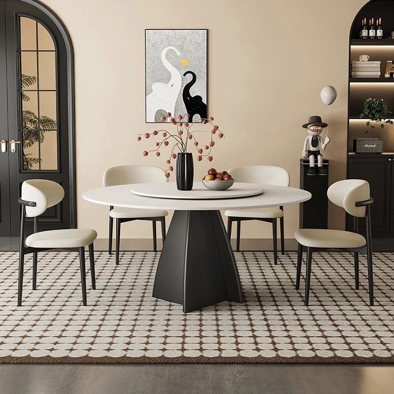 フレンチビンテージスタイルのダイニングテーブル&チェアセット、家庭用の黒い円形テーブル、回転プレート付き、イタリアンモダンシンプルな純白のラウンドテーブル。おしゃれで機能的な空間を演出!