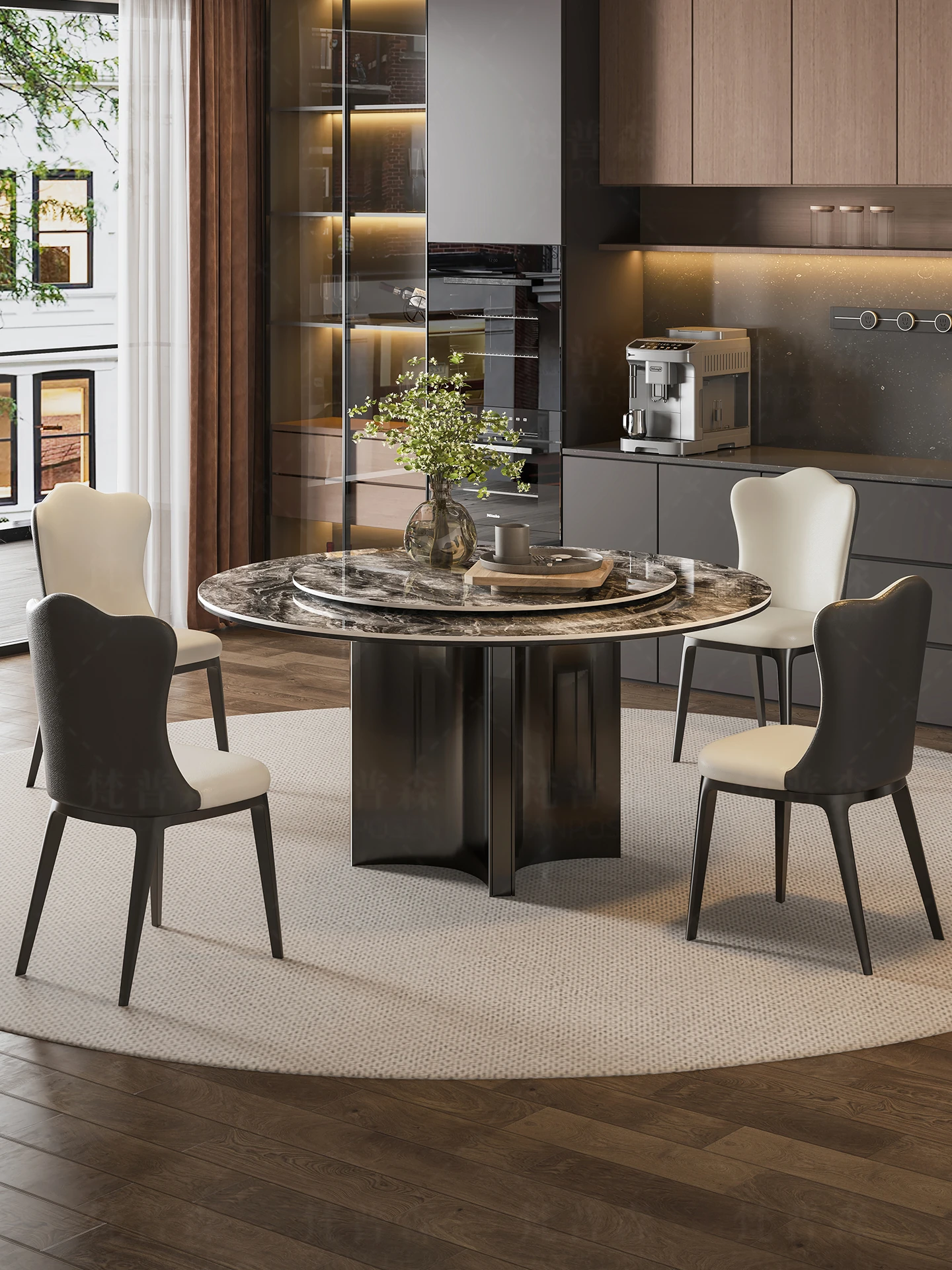 軽奢スタイルの岩板ダイニングテーブル&チェアセット!多機能電動回転盤内蔵、電磁調理器付きで温かい鍋料理も楽しめる。家族や友人との食事にぴったりな、贅沢なひとときを提供します!
