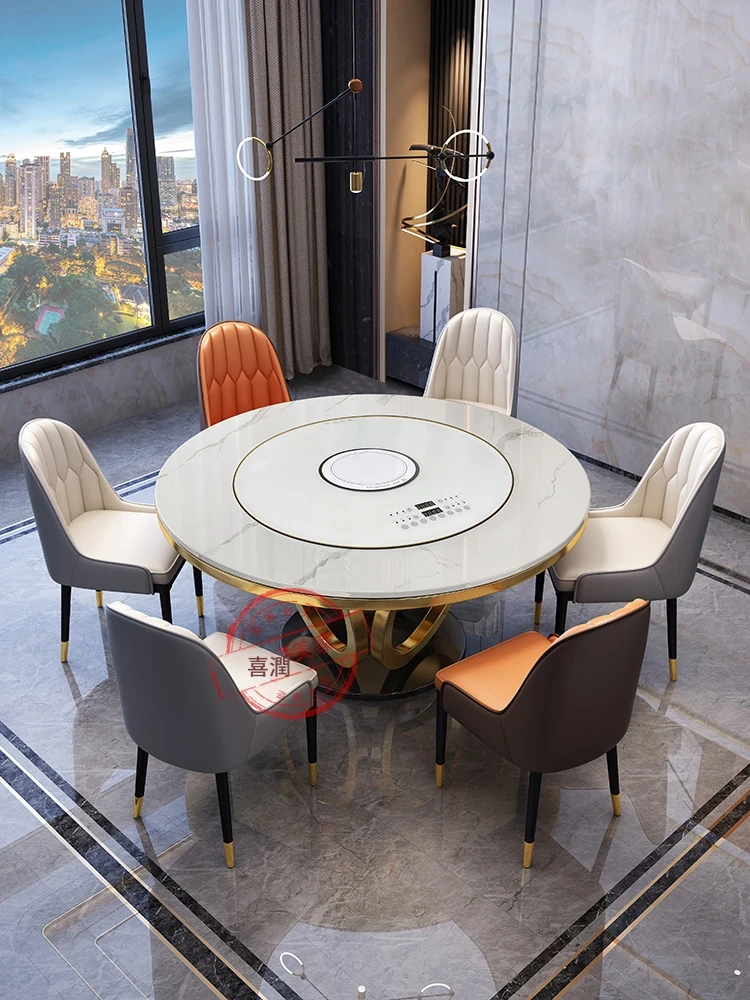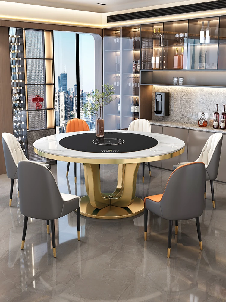 軽やかな贅沢感のある岩板ダイニングテーブル&チェアセット!家庭用火鍋にぴったりの電磁炉付き、多機能電動回転テーブル。シンプルでスタイリッシュな円形デザイン、食事の時間をもっと特別に!