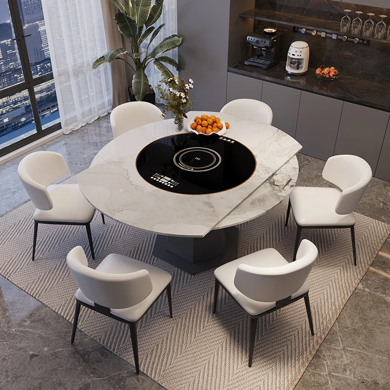 イタリアンミニマルデザインの回転式伸縮多機能岩板ダイニングテーブル、内蔵ヒートプレートと電磁調理器付き、円形テーブルでおしゃれな食卓を演出!