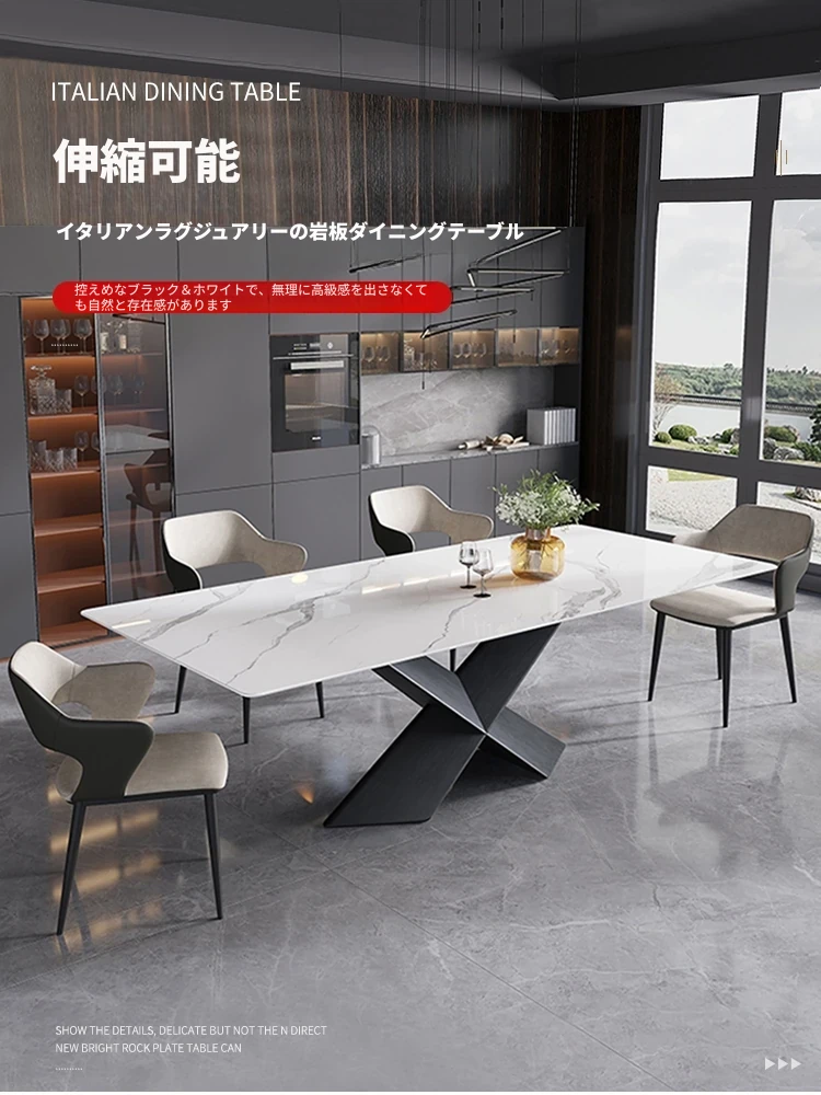 モダンデザインの伸縮式長方形岩板ダイニングテーブル - スタイリッシュな光沢仕上げ、家族や友人との食事に最適!引き出し式で空間を自由に活用できる、デザイナーこだわりの一品。