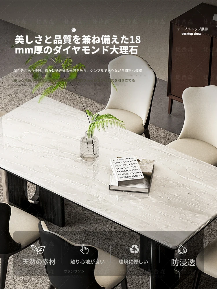 ヴァンピュソン輸入フィンディホワイト豪華石材ダイニングテーブル - 高級感あふれる大理石製、洗練されたデザインの家庭用ロングテーブル。上質なひとときを提供する、軽やかで贅沢なインテリアを演出します。