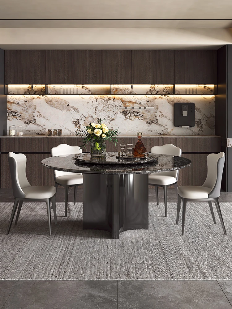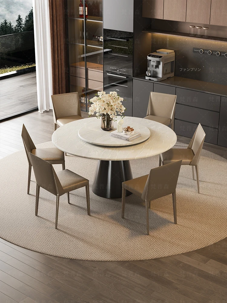 軽やかでシンプルなモダンデザインの岩板ダイニングテーブル&チェアセット。電磁調理器付きの円形大理石製テーブルは、どんなサイズの家にもぴったり。おしゃれで機能的な食事空間を演出します!