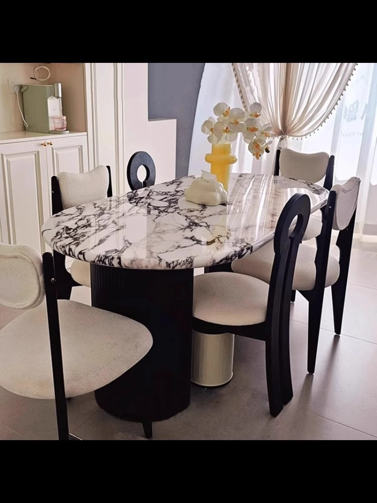 フランス風ボッテガ・ヴェネタデザインの大理石製モダンオーバルダイニングテーブルセット - 小型住宅にぴったりな洗練されたクリームカラーのインテリア。家族や友人との特別なひとときを演出します。